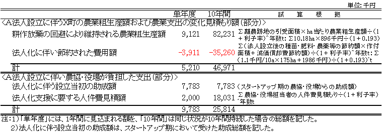 3)A法人の設立にともない,耕作放棄が回避されることによって,今後10年で8千2百万円の農業粗生産額の維持が見込まれた。一方,A法人の設立に対し農協や役場が負担する費用は10年で2千6百万円と見込まれた(表2)。