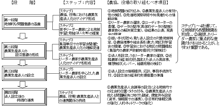 4)X町で実践された手順に基づき,農業生産法人の設立による新しい地域づくりのプロセスとして,4段階(6ステップ)からなる誘導手法を提案する(図3)。ここで重要なのは,地域内で農業生産法人化の必要性の認識を深め,リーダーを中心とする農家と農協や役場間で,農業生産法人設立に向けて相互に連動した取り組みがなされやすい状況を作ることである。