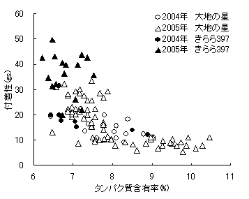 1)「大地の星」の炊飯米表面の「粘り」および「付着性」は、タンパク質含有率の増加に伴い低下し、「付着性」は同程度のタンパク質含有率の「きらら397」より低かった(図1)。