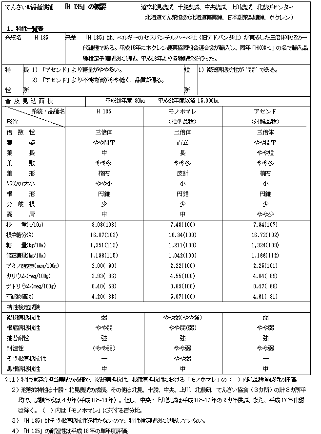 一方、製糖事業者においては、「砂糖及び甘味資源作物政策の基本方向」で、最大限の合理化を実施することが政策支援を受けるための前提とされている。一般的に、高品質な原料は製糖資材の削減に寄与するため、製造コストを継続的に削減するために、高品質な品種の導入、開発が必要とされている。「H 135」は、「アセンド」と比較して糖量がやや多い。また、不純物価がやや低く、品質面で優るため、製造コストの削減が期待される。 以上のことから、「H 135」を「アセンド」に置き換えて北海道一円に普及することにより、てんさいの安定生産に寄与できる。