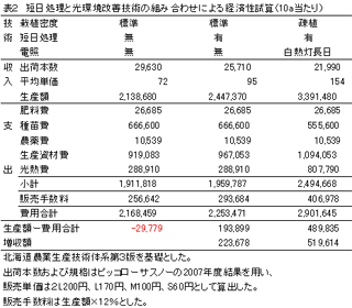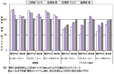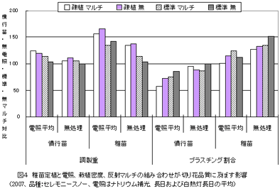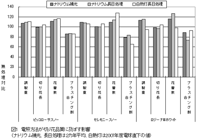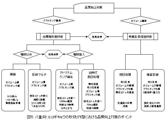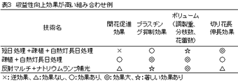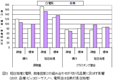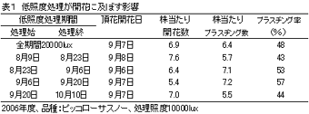1.目 的 八重系トルコギキョウの秋切り作型において、ブラスチング(花蕾の発育停止)発生を抑制するとともに総合的に切り花品質を向上させる技術を確立する。 2.方 法 1)時期別低照度処理がブラスチング発生に及ぼす影響(ポット試験、処理区は表1参照) 2)切り花品質向上技術確立試験(加温機付きパイプハウス) 供試品種:「ピッコローサスノー」(早生)、「セレモニースノー」(中晩生)、 「ロジーナⅢ型ホワイト」(晩生) 試験規模:1区20 or 30株、2区制、施肥量はN-P2O5-K2O=2.0-1.7-2.0㎏/a(ロング70) (1)電照による光環境改善効果 処理区:ナトリウムランプ昼間補光区(3000lux、12時間連続点灯)、ナトリウムランプ長日処理区(3000lux、 朝夕点灯、明期18時間)、白熱灯長日処理区(50〜120lux、朝夕点灯、明期18時間)、無処理区 (2)栽植密度による光環境改善効果 処理区:疎植区(2,778株/a)、標準区(3,333株/a) (3)反射マルチによる光環境改善効果 処理区:反射マルチ区(8月16日以降、通路に反射マルチを設置)、無マ ルチ区 (4)定植後の短日処理による栄養生長促進効果(ピッコローサスノーのみ供試) 処理区:短日処理区(定植翌日から30日間、17時〜9時を暗期)、無処理区 (5)稚苗定植による栄養成長促進効果(セレモニースノーのみ供試) 処理区:稚苗区(エクセルソイル512セル苗)、慣行苗区(2006年度288セル苗、2007年度406セル苗) 3.成果の概要 1)ブラスチングの多発には頂花開花期前後の低照度が大きく影響していると考えられた(表1)。 2)採花1ヶ月前からのナトリウムランプによる補光および長日処理では切り花のボリューム増加とブラスチング抑制に効果が認められた。白熱灯による長日処理では日長反応による開花促進効果および切り花長の増加が認められ,照度を100lux以上確保することにより花蕾数の増加やブラスチング抑制効果も認められた(図1)。 3)疎植および反射マルチの設置による光環境改善においても切り花のボリューム増加とブラスチング抑制効果が認められた。また、これらと電照法を組み合わせるとより品質向上効果が高まった(図2)。 4)栄養生長促進技術である定植後1ヶ月間の短日処理(図3)および稚苗定植(図4)では切り花のボリュームが大幅に増加したがブラスチングの抑制効果は認められなかった。 5)栄養生長促進技術と光環境改善技術を組み合わせることにより切り花のボリュームを増加させ、かつブラスチングを抑制することが可能であった(図3、4)。 6)経済性試算の結果、栄養生長促進技術と光環境改善技術を組み合わせることにより、収益性が大幅に向上すると考えられた(表2)。 7)以上より品質向上対策の考え方を図5に、収益性向上効果が高かった技術の組み合わせ例を表3に示した。