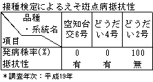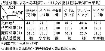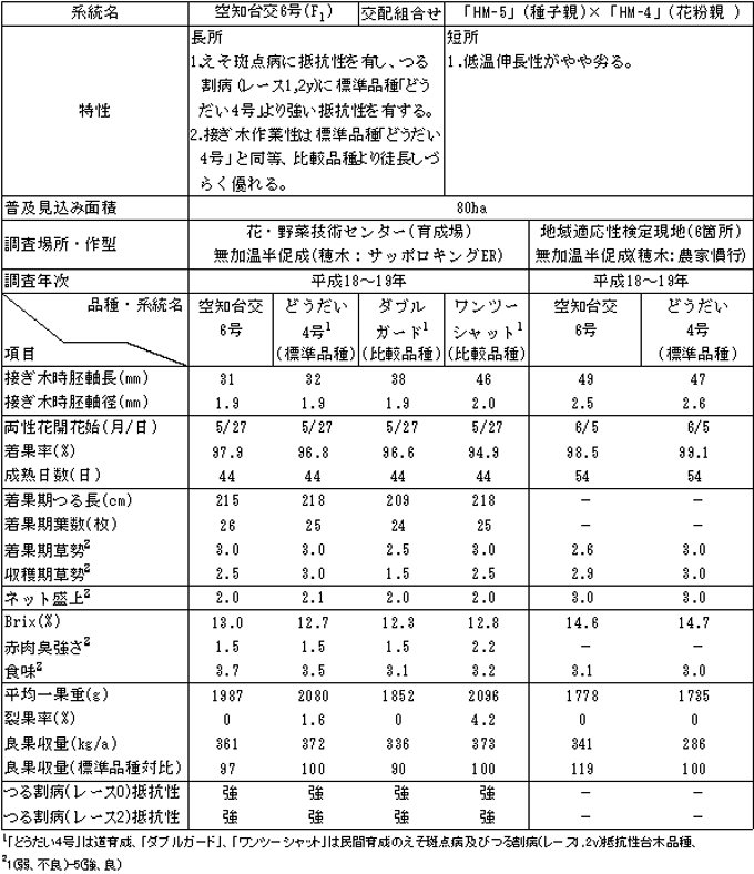 1.特性一覧表 ![]() ![]() 2.「空知台交6号」の特記すべき特徴 えそ斑点病及びつる割病(レース1,2y)(以下、レース1,2y)に対して強い抵抗性を有する。接ぎ木作業性が優れる。 3.北海道で優良品種に採用しようとする理由 「空知台交6号」は、えそ斑点病に対しては「どうだい4号」と同様に質的抵抗性を有し、レース1,2yに対しては「どうだい4号」より強い量的抵抗性を有するため、土壌病害抵抗性台木としての汎用性が高い。また、幼苗期に徒長しづらい特性を有しているため「ダブルガード」、「ワンツーシャット」より接ぎ木作業を行いやすい。さらに、穂木品種の収量・品質を損なわない優れた台木特性を有することから、えそ斑点病及びレース1,2yが発生した圃場や発生の恐れがある圃場におけるメロンの安定生産に貢献することが期待できる。 4.普及対象地域及び普及見込み面積 普及対象地域:全道のメロン栽培地域のうち、えそ斑点病、レース1,2yの発生が確認された圃場及び発生の恐れがある圃場とする。 普及見込み面積:80ha 5.保有種子量 「空知台交6号」 約 6,000粒 種子親「HM-5」 約 2,000粒 花粉親「HM-4」 約 2,000粒 6.栽培上の留意点 1)レース1,2yに対する抵抗性は「どうだい4号」より優るが、菌密度が高いと罹病する場合がある。従来の抵抗性台木でも発病する圃場では土壌還元消毒や輪作を行って菌密度を下げた後に「空知台交6号」を用いる。 2)低温伸長性が「どうだい4号」よりやや劣るため、道北地域では無加温半促成作型の内、4月上〜中旬定植の栽培を避ける。 3)無加温半促成作型における成績であり、加温半促成作型、トンネル早熟作型及びハウス抑制作型については未検討である。また、蒸し込み等の特殊な栽培管理方法についても未検討である。 4)接ぎ木を行った場合でも穂木に抵抗性が移行するわけではないため、穂木からの不定根の発生や接触伝染による罹病に注意する。 |