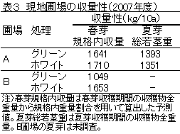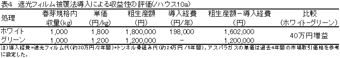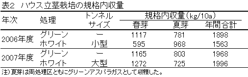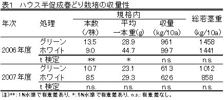 近年、青果用ホワイトアスパラガスの需要が伸びているが、慣行培土栽培法では収穫作業性や適応土壌などから栽培が限定され、供給量増加が妨げられている。本試験ではハウス作型での生産を目指し、遮光フィルムを用いた無培土栽培法について検討した。 2.方法 1) 場内試験 (1) ハウス半促成春どり栽培における大型トンネルを用いた遮光フィルム被覆法の検討 試験年次:2006〜2007年度 供試品種:‘ウェルカム’ 作型:ハウス半促成春どり栽培 試験規模:1区34株×2反復 供試フィルム:「ホワイトシルバー」((株)東罐興産製) 処理水準:遮光フィルム被覆ホワイト収穫区(ホワイト区)、グリーン収穫区(グリーン区)、同一ハウス内に試験区を設置 トンネルサイズ:高さ200cm、幅215cm 収穫期間:35日間 収穫調査:形状や茎色に問題がなく、24cm調製時に8g以上となる若茎を規格内とした。 (2) ハウス立茎栽培における小型トンネルを用いた春季遮光フィルム被覆法の検討 試験年次:2006年度 供試品種:‘ウェルカム’ 作型:ハウス立茎栽培 試験規模:1区9株×3反復 供試フィルム:同上 処理水準:同上 トンネルサイズ:高さ60cm、幅80cm 収穫期間:2006年4月21日〜9月20日(春芽収穫は35日間) 収穫調査:同上 (3) ハウス立茎栽培における大型トンネルを用いた春季遮光フィルム被覆法の検討 試験年次:2007年度 供試品種:‘ウェルカム’ 作型:ハウス立茎栽培 試験規模:1区9株×2反復 供試フィルム:同上 処理水準:同上 トンネルサイズ:高さ150cm、幅240cm 収穫期間:2007年4月16日〜9月15日(春芽収穫は35日間) 収穫調査:同上 2) 現地試験 (1) 春先のハウス側窓管理の検討 場所:栗山町 試験年次;2007年度 供試品種:‘スーパーウェルカム(現地圃場A)’、‘グリーンタワー(現地圃場B)’ 作型:ハウス立茎栽培 供試フィルム:同上 処理水準:遮光フィルム被覆ホワイト収穫区(大型トンネルを用いた遮光フィルム被覆法を用い、フィルム被覆直後から収穫開始まではハウス側窓閉め切り管理)、グリーン収穫区(慣行の温度管理)、処理はハウス単位で実施 試験規模:1区30株、反復なし 3. 成果の概要 1)ハウス内の大型トンネルに遮光フィルムを被覆することで無培土のホワイトアスパラガス生産が可能であった。この方法を用いたホワイトアスパラガス栽培ではグリーンアスパラガス栽培と比較して収穫本数は減少するものの、若茎一本重が増加するため収量性は同程度であり(表1)、若茎頭部の形状はグリーンアスパラガス若茎よりも締まりが良く、アントシアニン着色も目立たなかった(図表省略)。 2)フィルム被覆によりトンネル内の地温上昇が抑えられ、収穫開始期が遅れる傾向にあった。また、収穫作業は暗黒下で行うが、グリーンアスパラガス栽培と比較して収穫作業性が大きく劣ることはなかった(図表省略)。 3)小型トンネルの場合は収穫作業効率が著しく劣った。また、若茎にアントシアニンが着色し、グリーンアスパラガス栽培よりも春芽規格内収量が減収した。一方、大型トンネルの遮光フィルム被覆法をハウス立茎栽培に導入することにより春季をホワイトアスパラガス、夏季をグリーンアスパラガスとして収穫することが可能であった(表2)。 4)現地試験のハウス立茎栽培においても春季ホワイトアスパラガス、夏季グリーンアスパラガス収穫が可能であった(表3)。また、フィルム被覆直後のハウス側窓閉め切り管理によりトンネル内の地温上昇効果が認められた(図表省略)。 5)青果用ホワイトアスパラガスはグリーンアスパラガスより高単価で取引されており、必要資材導入費を差し引いても充分な利益が期待できる(表4)。 6)“ハウス作型における遮光フィルム被覆による無培土栽培マニュアル”を作成した(図1)。 ![]() ![]() ![]() ![]() 1)フィルム被覆 ・萌芽を確認したら速やかにトンネルを設置して遮光フィルムを被覆する(本試験では(株)東罐興 産製の「ホワイトシルバー」を「ホワイト面」を表にして被覆した)。 ・トンネル内に光が少量でも入ると若茎にアントシアニンが着色するためトンネル内は常に暗黒条 件を維持するように努め、光漏れを見つけた場合は速やかに修復する。特に入り口付近は光が漏 れやすいので注意する。 2)トンネル内の温度管理 ・フィルム被覆直後から収穫開始期までは地温確保を目的としたハウス側窓閉め切り管理を行う。 ・収穫開始期からはトンネル内の気温(地上高15cm)35℃以下を目安にハウスの換気を行う。 3)収穫作業 ・日の出とともにトンネル内の気温は急上昇し、高温多湿条件となるので収穫作業は早朝に終わら せる。また、事故防止のため日中のトンネル内作業は避ける。 ・ハウス立茎栽培での春芽収穫期間は35日、春芽目標収量は1.0t/10aとし、目標収量に達した場 合は35日に満たなくとも収穫を打ち切る。明らかな低収圃場やハウス半促成春どり栽培ではこ れまでのグリーンアスパラガス栽培での春芽平均収量を算出し、その値を目標収量に設定する。 ・収穫作業時には頭にヘッドライトを装着すると作業しやすい。 ・アントシアニン着色を防