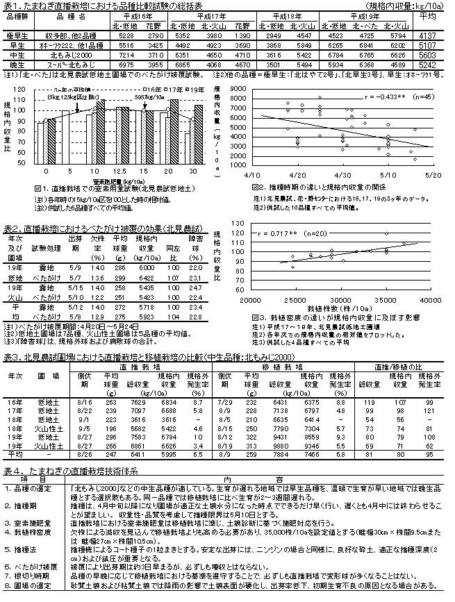 たまねぎ直播栽培の実用化に向けた栽培技術確立のため、移植栽培と比較しながらその生産性を検証する。これにより、低価格が強く求められる加工・業務需要に対応できるような低コスト生産を実現するとともに、規模拡大や新規作付けを検討している生産者に対して、たまねぎ栽培導入に際しての新たな選択肢を提供する。 2.方 法 1.適品種の選定:16〜19年、極早生〜晩生品種まで12品種を供試 2.窒素施肥量の検討:16、17、19年、品種数7、窒素施用量7水準(0、5、10、12.5、15、20、30㎏/10a) 3.播種時期の検討:16〜19年、品種数10、播種日の設定:4月18日〜5月16日 4.栽植密度の検討:17〜19年、品種数4、栽植密度の設定:24690〜39216株/10a 5.べたがけ被覆の効果確認:18〜19年、品種数7 6.移植栽培との比較による直播栽培の生産性評価:16〜19年、品種数8、北見農試圃場において標準耕種法による両栽培試験区を比較 7.現地実証試験(網走管内):19年、試験実施場所数6 3.成果の概要 1)収量性及び品質の面から「北もみじ2000」等の中生品種が有望であった。「北もみじ2000」では、北見農試 及び花・野菜技術センターでの4ヶ年、計11試験の平均で規格内収量は5600㎏/10aとなり、春まき移植栽培の基準収量である5500㎏/10aを上回った(表1)。晩生品種ではさらに球肥大は進むが、地域や年次により内部品質が低下したり、倒伏期に至らない場合があった。 2)北見農試低地土圃場における窒素用量試験の結果では、施肥量は10〜12㎏/10aでも充分であった(図1)。直 播栽培における施肥量は移植栽培に準じ、土壌診断に基づく施肥対応を行う。 3)播種日が遅くなるほど収穫時の球重は低下した。4月下旬〜5月中旬の間では、播種が一日遅れるごとに収量 が約1.5%ずつ減少した(図2)。 4)播種は、4月中旬以降になり圃場が適正な土壌水分になった時点でできるだけ早く行い、4月中には終わらせることが望ましい。播種日が5月15日を過ぎると、倒伏に至らない株や腐敗球の発生が多くなる場合があったことから、播種限界は5月10日とする(図2)。 5)株間を狭くすることで栽植密度を高めた場合、平均球重は低下するものの収量は増加する。現在の移植栽培 における平均的な栽植株数である30000株/10aに対して、直播栽培では欠株による減収も見込んで栽植密度を 35000株/10a程度とする(図3)。 6)べたがけ資材の被覆により出芽期は3日程度早まるが、必ずしも増収にはつながらなかった(表2)。 7)現在、道内で多く作付けされているF1品種であれば、移植栽培と比較して直播栽培での変形球発生が多くなることはなかった。根切り時期は、品種の早晩に応じて移植栽培における基準を遵守する(表3)。 8)北見農試圃場における比較では、直播栽培での球肥大は移植栽培に優る場合もあるが、欠株や多雨年での肌腐れ症状等の影響により、4ヶ年平均での規格内収量は移植栽培に対して約20%の減収となった。しかし、「北 もみじ2000」の直播栽培区における総収量は6400㎏/10a、規格内収量は6000㎏/10aであり、産地への普及が可能な収量水準を達成することはできた(表3)。 9)網走管内の農家圃場6ヶ所での現地試験では、欠株率の平均は6.5%であり出芽は比較的良好であったが、全 般的に土壌が硬く締まる傾向があり、球肥大はやや劣った。2ヶ所の圃場で変形球が多発したこともあり、規格内収量の平均は4200㎏/10aとなり、基準収量である5500㎏/10aを下回る結果となった(データ省略)。 10)腐植含量が少ない砂質土壌や排水不良な粘質土壌では降雨の影響で土壌表面が硬化し、出芽率低下や初期 生育不良により低収となる場合があった(現地実証試験、表1の16年・花野及び18年・北見低地土)。直播栽培では移植栽培よりも土壌環境の影響を受けやすいことが想定され、腐植含量が多く、透・排水性に優れた圃場の選定が重要となる。 11)本試験での成果から、たまねぎの直播栽培技術体系を提案する(表4)。 ![]() 4.成果の活用面と留意点 1)たまねぎの直播栽培を導入するにあたっての技術資料とする。 2)本課題での直播栽培における除草剤(土壌処理剤)の登録拡大試験により、平19年にペンディメタリン乳剤が登録された。 3)たまねぎ直播栽培では、出芽が不安定となる砂質土壌及び粘質土壌での栽培をできる限り避ける。 4)直播栽培では、移植栽培に比べて生育が2〜3週間遅れるため、8月以降の病害虫防除に留意する。 5.残された問題点とその対応 1)現地事例で変形球が多く発生する要因の解明 2)本成果に基づく直播栽培技術の総合実証 |
