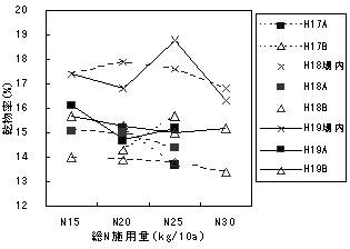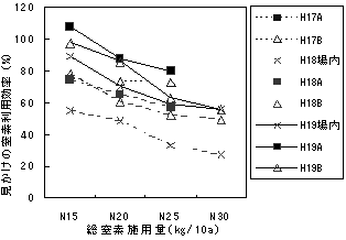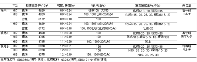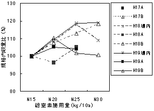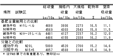 4.成果の活用面と留意点 1) 本成果は、規格内収量4000kg/10aを目標とする際の目安として用いる。 2) 本成果は、十勝中央部の窒素地力の比較的低い(熱水抽出性窒素1〜6mg/100g)火山性土において得られたものである。 3) 本成果で提案した以外の栽培条件は既往の成績に準ずる。 5.残された問題とその対応 1) 施肥窒素の利用率向上方策の検討 2) 現地栽培における乾物率向上方策の検討 |
