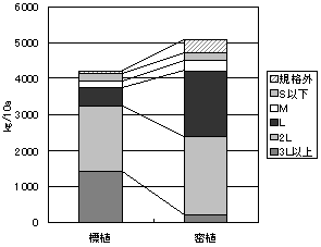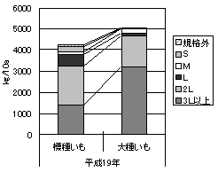 ながいもの輸出用(3L以上)及び国内向け(2L,L)の収量を向上するための窒素施肥量、種いもの大きさ及び栽植密度を明らかにする。 2.試験方法 1) 試験場所および土壌 十勝農試場内 火山性土(造成相)、現地A,B:帯広市 火山性土(砂壌土) 2) 供試品種 十勝選抜系 3) 試験処理区 ![]() 3.成果の概要 1) 窒素施用量20及び25kg/10a区の規格内収量(S以上)は、15kg/10aに比べて高まる場合が多く、かつ4000kg/10aを確保できたが、30kg/10a施用では頭打ちあるいは低下した(図1)。 2) ながいもの窒素吸収量は,総収量の増加に伴い有意に高まったが、規格内収量との関係は判然としなかった。すなわち、単純に窒素吸収量を増やすことが規格内収量を高めることにつながらないことが示唆された(データ省略)。 3) 窒素5kg/10aの増肥に対して、ながいもの窒素吸収量の増加は2kg/10a程度に止まったので、見かけの施肥窒素の利用効率は低下した(図2)。そのため、施肥窒素量が多いと、跡地土壌の無機態窒素残存量も高まった。その傾向は特に窒素25及び30kg/10a区で顕著であり、両区では地下水への硝酸性窒素汚染リスクも高まることが危惧された。 4) ながいもの内部品質として重要な乾物率は、17%を得られたのは十勝農試の場内試験のみであった。現地試験での乾物率は、13〜16%の範囲で変動していたものの、窒素施用量が増加すると15kg/10a区よりやや低下したが、有意差はなかった (図3)。 5) 緩効性窒素を利用した場合、同量の全量基肥施用や7月上中旬分施と比較して、規格内収量や窒素吸収量に有意な差は認められなかった(表1)。このことから窒素20kg/10a施用する場合は緩効性窒素肥料の利用が可能である。また、現行の施肥標準である窒素15kg/10aでは規格外品の増加が懸念される。 6) 施肥窒素20kg/10aの条件で、植え付けの種いもを150gと大きくすることにより、いも径が太くなり、いも重も増え、3L規格以上の収量が高まった(図4)。このことから、種いも重によって輸出用規格割合を高めることが可能であることが示唆された。 7) 標準の100g種いもを用いて、畦間を変えずに、株間を24cmから18cmに狭める密植(裁植密度6,170本/10a、窒素施肥量20kg/10a)を行うと、2L〜L規格および規格内収量が増加した(図5)。 8) 以上より、規格内収量を4000kg/10a程度確保した上、3L規格以上の収量は種いもを大きくすることで、また、2L〜L規格の収量は密植することで増やすことができる。窒素施肥量はいずれの場合も規格内収量を確保し、土壌中残存窒素を少なくする観点から20kg/10aが適当である。