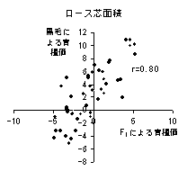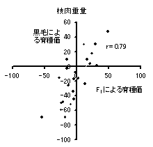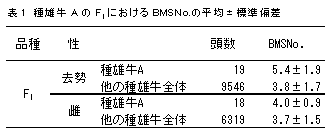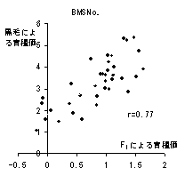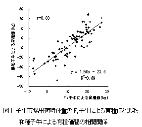 交雑牛(F1:黒毛和種種雄牛×ホルスタイン雌牛)の成績が黒毛和種種雄牛の育種価評価に利用可能であるかを検討する。また、交雑牛を利用した黒毛和種種雄牛の産肉能力検定(F1検定モデル)を試行し、その優位性を検討する。 2. 方法 1) 交雑牛を用いた黒毛和種種雄牛の発育能力に関する育種価評価 F1子牛の発育における遺伝的要因の関与の程度を明らかにし、F1の子牛市場成績が黒毛和種種雄牛の育種価評価に利用可能であるかを検討する。 2) 交雑牛を用いた黒毛和種種雄牛の産肉能力に関する育種価評価 F1の枝肉成績における遺伝的要因の関与の程度を明らかにし、F1の枝肉成績が黒毛和種種雄牛の育種価評価に利用可能であるかを検討する。 3) 交雑牛を利用した黒毛和種種雄牛の能力検定モデル F1を利用した黒毛和種種雄牛の産肉能力検定を地域内一貫肥育体制において試行し、種雄候補牛の選抜に利用可能であるかを検討する。 3. 成果の概要 1) F1の子牛市場出荷時体重の遺伝率は0.12と推定され、育種価評価が可能であると考えられた。F1の子牛市場成績と黒毛和種の子牛市場成績からそれぞれ予測した黒毛和種種雄牛の育種価間には0.83の高い相関が認められ(図1)、黒毛和種種雄牛の発育能力に関する育種価評価にF1の子牛市場成績は利用可能であると考えられた。 2) F1の枝肉成績の遺伝率は0.24〜0.51と推定され、育種価評価が可能であると考えられた。F1の枝肉成績と黒毛和種の枝肉成績からそれぞれ予測した黒毛和種種雄牛の育種価間には0.77以上の高い相関が認められ(図2)、黒毛和種種雄牛の産肉能力に関する育種価評価にF1の枝肉成績は利用可能であると考えられた。 3) F1の地域内一貫肥育体制を利用した黒毛和種種雄牛の産肉能力検定(F1検定モデル)を試行した。BMSNo.の能力が高い黒毛和種種雄牛AはF1においてもBMSNo.の能力が高いことが確認され(表1)、F1検定モデルが種雄候補牛の選抜に利用可能であることが示唆された。F1検定モデルには交配雌牛の確保の容易性、検定費用の抑制、検定期間の短縮等に優位性があると考えられた。 黒毛和種種雄牛の発育能力および産肉能力の育種価評価に、交雑牛の成績を用いることが可能であると考えられた。交雑牛を用いた黒毛和種種雄牛の産肉能力検定(F1検定モデル)を試行し、F1検定モデルが種雄候補牛の選抜に利用可能であることが示唆された。F1検定モデルは交配雌牛の確保の容易性、検定費用の抑制等に優位性があると考えられた。 ![]() ![]() 図2 枝肉重量(右上)、ロース芯面積、BMSNo.のF1による育種価と黒毛和種による育種価間の相関関係 ![]() 4. 成果の活用面と留意点 1)
