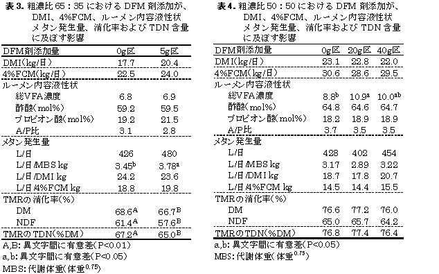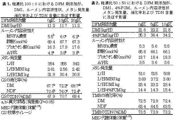 1.目的 自給粗飼料を主体とした本道酪農において、輸入濃厚飼料に依存せず、安全な牛乳を持続的に生産するためには、自給粗飼料の品質を高めるとともに、飼料を効率的に利用する必要がある。DFM(direct-fed microbial;直接給与生菌)剤は有用微生物の働きによって飼料利用効率の向上が期待されるが、微生物の組み合わせや割合によりその効果が大きく異なる。本課題で供試したDFM剤(BLCSルナシータDIBA、日本エメラル社)は、ルーメン内でプロピオン酸生成菌が乳酸とメタン生成の原料となる水素からプロピオン酸を生成することに着目したメタン生成量の削減と、繊維消化率の向上を目的として開発された製剤である。すなわち本製剤は、乳酸生成菌により乳酸が効率よく生成されるとともに、繊維分解菌が増殖しやすいように配慮された微生物の構成割合となっている。そこで、本課題では北海道酪農の主要な粗飼料であるチモシー主体牧草サイレージを用いた飼養条件において、DFM剤添加給与による粗飼料の利用効率向上効果について検証した。 2.方法 乳牛におけるDFM剤の添加給与が、摂取量、乳量、ルーメン内容液性状、メタン発生量および消化率に及ぼす影響について、以下の構成で試験を実施した。 1)乾乳牛における粗濃比100:0の飼料給与時のDFM剤添加効果 2)泌乳牛における粗濃比50:50の飼料給与時のDFM剤添加効果 3)泌乳牛における粗濃比65:35の飼料給与時のDFM剤添加効果 4)泌乳牛における粗濃比50:50の飼料給与時のDFM剤添加量増給効果 3.成果の概要 1)粗濃比100:0(乾乳牛)におけるDFM剤添加(10、20g)により、ルーメン内容液の総VFA濃度は有意に増加(P<0.05)、A/P比は有意に低下(P<0.05)したが、メタン発生量に対する影響はなく、DM、OM、およびNDF消化率は高くなる傾向を示し、0gと10g区間は有意な差(P<0.05)となり、その結果TDN含量は高くなる傾向を示した(P=0.12)(表1)。 2)粗濃比50:50(泌乳牛)におけるDFM剤添加(5、10g)は、DMI、ルーメン内容液性状、メタン発生量および消化率に影響を及ぼさなかった(表2)。 3)粗濃比65:35(泌乳牛)におけるDFM剤添加(5g)により、DMIは増加傾向(P=0.12)、プロピオン酸割合は高まる傾向(P=0.14)、A/P比は低下の傾向(P=0.11)、メタン発生量は増加傾向(P=0.06)を示したが、DMIあるいは4%FCMあたりのメタン発生量に違いはなく、NDF消化率およびTDN含量は有意に低下した(P<0.01)。しかし、これらの結果は処理よりも個体差によるDMI増加の影響が大きいと考えられた(表3)。 4)粗濃比50:50(泌乳牛)におけるDFM剤の添加(20、40g)により、総VFA濃度は高くなる傾向を示し、0g区と20g区間に有意差(P<0.05)が認められ、プロピオン酸割合は増加、A/P比は低下の傾向を示した。しかし、メタン発生量および消化率に影響しなかった(表4)。 まとめ DFM剤の添加により、ルーメン内容液のプロピオン酸割合は高く、A/P比は低下する傾向を示したが、メタン発生量の低減は認められなかった。粗飼料割合100%DMでDFM剤を添加することにより、NDF消化率は向上し、TDN含量は高まる傾向がみられ、粗飼料の利用効率向上効果が示唆された。しかし、飼料中の粗飼料割合を65%〜50%DMに低下させると、同様の効果は確認できなかった。 以上から、本DFM剤は一部、ルーメン内容液性状および成分消化率に効果が認められたものの、その効果は飼料構成や乳牛の生理状態などに影響を受けると結論づけられた。 ![]() ![]() 4.成果の活用面と留意点 1) 本試験において、DFM剤添加給与はトップドレスで行った。 2) 本製剤は「飼料の安全確保及び品質の改善に関する法律」に基づき、届出済みの飼料である。 5.残された問題とその対応 泌乳牛用飼料に適したDFM剤中の微生物構成割合に関する検討。 |