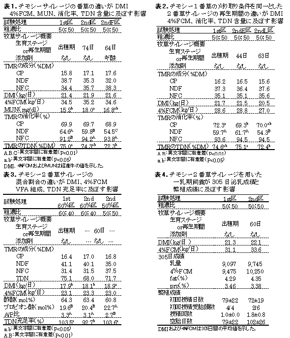 牧草サイレージ収量の約4割をしめる2番草サイレージは、その栄養価や乳生産性に関する情報が少ない。生産現場では1番草刈り取り後の施肥管理、2番草サイレージの刈り取り時期や調製条件が多岐にわたっており、「嗜好性が悪い」、「栄養価が低い」あるいは「腹持ちが悪い(ルーメン内の滞留時間が短い)」などと評価されている。この低い評価は経験に基づくことが多く、また2番草それ自体の要因と草地管理や調製技術上の要因が混在した評価であり、整理されていないのが現状である。 本課題ではチモシー2番草サイレージ自体の栄養特性および乳生産性に焦点を当てて検討を行なった。 2.方法 1)番草の違いが摂取量、消化性および乳生産に及ぼす影響 粗濃比50:50(乾物比)のTMRにおける粗飼料源として、チモシー1番草サイレージ(出穂期:1st区)を2番草サイレージ(再生期間74日(2nd区)あるいは64日ギ酸添加(2ndF区))に代替し、給与したときの影響を検討した。 2)チモシー2番草サイレージの再生期間の違いが摂取量、消化性および乳生産に及ぼす影響 試験1と同様のTMR条件で、チモシー1番草サイレージ(出穂期:1st区)を、再生期間44日(2ndE区)と63日(2ndL区)としたチモシー2番草サイレージに代替し、給与したときの影響を検討した。 3)チモシー2番草サイレージ(再生期間60日)の混合割合の違いが摂取量および乳生産に及ぼす影響 粗濃比の違いが泌乳牛の飼料摂取量および乳生産に及ぼす影響を検討した。 4)番草の違いが一乳期乳生産および繁殖性に及ぼす影響 チモシー2番草サイレージ(再生期間60日)を用いたTMRを給与した時の乳生産と繁殖性を検討した。 3.成果の概要 1.チモシー1番草サイレージ(出穂期)を用いた場合と比較して2番草サイレージでは、DMI(21.4~21.9kg/日)および4%FCM(34.5~35.2kg/日)には、差が見られなかった。2番草サイレージの化学成分の特徴はCPとNFC含量は高くNDF含量は低いこと、消化性の特徴は、NDFは低く、NFCは高いことが示された。2番草を用いたTMRは、1番草利用時に比べて、TDNは低くCPは高くなり、MUNは高くなった。しかし、TDN含量は72%DM以上あることから、乳量34kg/日程度の泌乳牛用飼料と試算された(以上表1)。 2.チモシー2番草サイレージのNDF消化率は、2番草の再生期間が長くなると低下した。再生期間40日程度の2番草サイレージを用いたTMRであれば、1番草サイレージ(出穂期)利用時のTMRと同等の栄養価となった(表2)。しかし、再生期間を40日程度とすると、その後の再生状況によって掃除刈り等の対応が必要となる。 3.チモシー2番草サイレージの給与割合を50%から60%に高めると、DMIの低下、ルーメン内容液のA/P比の上昇がみられた(表3)。 4.粗濃比50:50のTMR粗飼料源として、チモシー出穂期1番草サイレージを用いた区と再生期間60日程度のチモシー2番草サイレージを用いた区で比較すると、305日間の4%FCMは、それぞれ9,475kg、10,250kgだった。また、乳成分および繁殖成績は概ね良好に保たれた(表4)。 以上のことから、チモシー2番草サイレージは、1)1番草サイレージに比べてNDF消化率は低く、再生期間が長くなるとNDF含量の増加とともに消化率はさらに低下し、その結果TDN含量が低下する。2)給与比率を50%から60%に高めるとDMIは低下し、A/P比は上昇する。3)再生期間60日程度のチモシー2番草サイレージであれば、粗濃比50:50の泌乳牛用TMR条件で、1番草サイレージ(出穂期)と同程度の産乳性があることが示された。 ![]() 4.成果の活用面と留意点 1)適正に調製された細切サイレージの利用を前提とする。 2)2番草の早刈りは再生草の残留や植生悪化の可能性があり、実施には十分な注意が必要である。 5.残された問題とその対応 チモシー2番草サイレージを効率的に利用するための検討 1)1番草刈り取り時期の違いによる2番草サイレージの品質評価(飼料成分、消化性、産乳性)。 2)低繊維消化率および高MUNに対応した併給飼料と飼料構成の検討。 以上問題点は、次期試験課題「チモシー主体2番草サイレージの品質評価と効率的給与体系の確立」でさらに検討する。 |