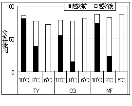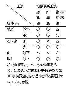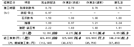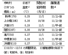 傾斜地等の条件不良草地の生産性回復を進めるため、簡易草地更新法と牧草の初冬季播種法を組み合わせて種子流亡や表土流亡等のリスクを克服しつつ更新可能期間の拡大と所用時間の短縮及び低コスト化を図る植生改善技術を開発する。 2.方法 1)牧草の低温出芽性の解明と地域別の初冬季播種適期の設定 2)簡易更新工法による傾斜石れき草地の植生改善効果 3)初冬季播種牧草の定着安定化技術の確立 4)簡易更新・初冬季播種による植生改善効果の現地実証 5)簡易更新の施工所要時間および経費試算 3.成果の概要 1)平年的な漸低下温度条件下では、チモシーは日平均気温6℃以下で播種すると越冬前出芽を回避出来(図1)、一時的昇温については、日平均気温7℃で3日間続くと越冬前に半数程度の種子が出芽する危険がある。 2)十勝管内各地のアメダス気温データによると初冬季の日平均気温は約4日で1℃ずつ低下し、一時的な気温上昇の出現の終息時期には地域毎に一定の傾向がみられることから、前記1)の低温出芽性を基に、越冬前出芽を回避して安定的に早春の出芽・定着が見込まれる「初冬季播種適期」を町村毎に設定した(表1)。この事は、播種期間の2〜4週間の拡大を意味する。 3)作溝法および穿孔法による初冬季播種は傾斜草地の植生改善に有効である。表土の流亡は発生しなかった。穿孔法による初冬季播種は石れき草地の植生改善にも有効であった。 4)pH改善の観点から見た場合の簡易更新の対象草地は、pH5.5以上とするべきである。傾斜地のため簡易更新が最優先の条件の場合は、防散石灰と粗砕石灰を混用し穿孔法によって出来るだけ石灰の土壌混和を図ることでpH5.5以下の草地への適用が可能と思われた。 5)簡易更新・初冬季播種における基肥窒素施用は、施用時期は早春、施用量は4〜6kgが望ましい。 6)簡易更新・初冬季播種による現地実証試験では、1番草で概ね75%以上のチモシー率が得られた(表2)。表土や種子の流亡は起きなかった。 7)試算によるヘクタールあたりの施工時間は、完全更新の12.39時間に対して簡易更新では4.27時間(34.5%)〜6.85時間(55.3%)であった。また総工事費は、完全更新の426,419円に対して308,065円(72.2%)〜346,014円(81.1%)であった(表3)。なお、工法に関係なく必要な資材費等を除いた機械費分で比較すると、完全更新(112,149円)に比べて簡易更新は38.9%〜60.1%であった。 8)以上の知見をもとに、傾斜地等の条件不良草地に対する各種工法の適用場面と効果を整理した(表4)。 4.成果の活用面と留意点 1)施工予定草地の事前調査(植生診断、土壌診断)を行う。 2)播種量は、地域の完全更新時の標準的な播種量と同程度とする。 3)雑草の発生が多くチモシーの生育が抑制される恐れがある場合は、適宜の掃除刈りを行う。 4)マメ科草の初冬季播種は困難と言われており追播が望ましい。 5)本成績は、傾斜地で行った試験成績であるが、平地での草地更新にも活用出来る。 5.残された問題 1)初冬季播種出芽当年の草地管理法(草地条件別施肥法、秋の雑草「エゾノギシギシ」対策) 2)ルートマットの厚さと簡易更新工法別出芽・定着率。 3)初冬季播種によるマメ科牧草混生率向上方法の確立。 4)簡易更新草地の理化学性推移と植生維持年限の解明。 表1 初冬季播種適期 ![]() 図1 初冬季の漸低下温度条件処理に伴う主 要イネ科牧草の出芽性 表2 現地実証試験における植生改善効果 表4 簡易耕・初冬季播種による草地の (2006年初冬季播種施工、2007年出芽当年1番草) 植生改善の摘要場面と効果 ()内は、順に斜度、pH、前植性の優占草種、播種施工月/日を示す。 工法:GH=穿孔法、OS=作溝法(狭条)、SM=作溝法(通常)。供試面積は各工法とも約30a。 作業体系:除草剤散布(秋)→石灰散布・播種床処理・播種(初冬季)→施肥(早春)。 圃場出芽率: 100×出芽数/(実播種量:g/㎡×粒/g)により算出。 表3 施工時間および施工経費(ha当たり)試算 |