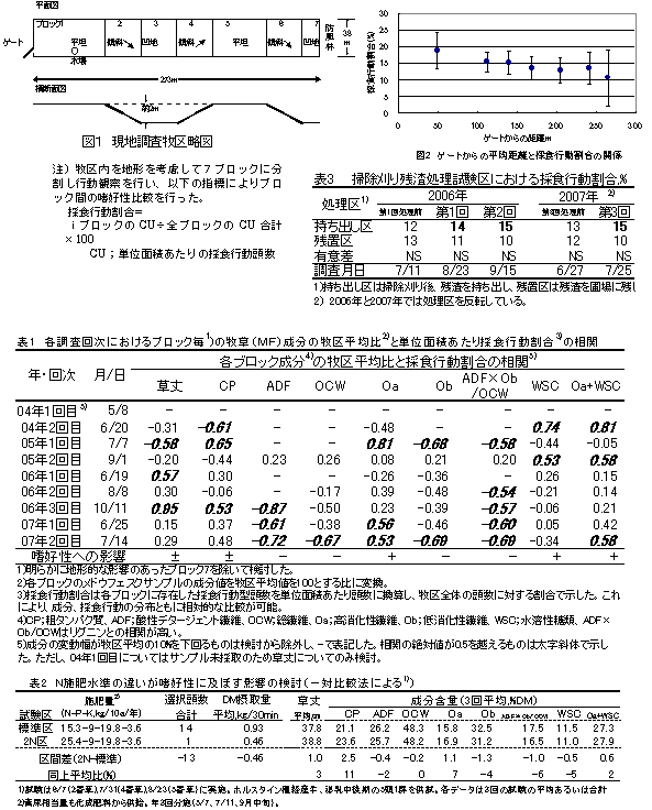 放牧草の嗜好性を左右する要因を整理し、嗜好性の良い放牧草地の管理方法についての情報を提供する。 2.方法 1) 放牧実施農家圃場における地形と放牧草成分の影響検討(行動観察による。対象牧区;MF主体1ha、放牧頭数;搾乳牛群42〜49頭) 2) 窒素施肥量および施肥資材の違いが嗜好性に及ぼす影響の検討 3) 掃除刈残渣が放牧草の嗜好性に及ぼす影響の検討(場内、チモシー主体草地) 3.成果の概要 1)-(1) 奥行き/幅比=7.18(中央と最奥に高低差2〜3m程度の凹地あり、ゲート付近に水槽設置)の牧区(図1)における一頭あたり牧区幅0.8〜0.9m、日中のみの放牧条件では、暑熱ストレスを受ける条件などによりばらつくが、ゲートからの距離が長くなるほど採食を含む各行動型の時間が短くなる(放牧地の利用性が低下する)傾向が観察された(図2)。牧区レイアウトの際には起伏の多い地形に長方形の牧区の組み合わせは避け、水槽を牧区奥に配置するなどの対策が必要である。 1)-(2) 4カ年9回の行動観察結果を用いて各ブロックの放牧草(MF)成分の牧区平均比と採食行動型割合の相関を調べたところ、ADF、ADF×Ob/OCWは負の、OaおよびWSC+Oaは正の影響を及ぼすことが示唆された(表1)。ADF×Ob/OCWはADLリグニンと相関の強い項目である。成分の影響の強さの順列は一律ではなく、成分の変動幅などに影響を受けて変動すると考えられた。成分変動要因の一つとして牧区内の起伏に起因する肥料養分の偏りが考えられた。嗜好性のばらつきを抑えるためには地形を考慮した施肥について検討する必要がある。 2)-(1) 窒素施肥量を標準施肥より増やして一対比較法試験を行ったところ、過剰に窒素施用した区の嗜好性は明らかに低下した。過剰な窒素を施用した区の牧草中成分は標準区と比較してCPおよびOa含量が高くなり、その他の繊維およびWSC含量が低下傾向を示した(表2)。過剰なN施肥が嗜好性を低下させることを確認した。 2)-(2) 施肥成分量は一定とし、酸性促進型と中性維持型を想定した施肥資材の組み合わせ間で一対比較法により嗜好性を検定したが、短期的には両者に差は認められなかった(データ省略)。 3)-(1) 草丈30㎝で利用率70%を想定した条件で、牧区内に掃除刈り残渣残置区と持ち出し区を配置し、処理後約3週間後に肉牛を入牧し採食行動を観察した。各回次においては有意差が認められなかったものの、3回の調査すべてで残置区での採食行動割合が低下した(表3)。夏場の放牧草嗜好性向上に掃除刈り残渣の持ち出しが有効であると考えられた。 以上、農家調査事例等から放牧草の嗜好性低下に係わる要因を抽出し、解析した結果、放牧草地管理上の参考となる一定の知見を得た。 ![]() 4.成果の活用面と留意点 ・放牧地の管理方法研究における参考となる。 5.残された問題とその対応 ・嗜好性の改善方法の実証 |