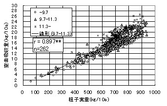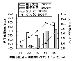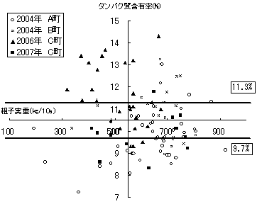 道央における秋まき小麦の収量・品質安定化のため、その変動要因を明らかにし、改善策を示す。また、収量水準・タンパク質含有率に適合した窒素吸収量の目安を設定する。 2.試験方法 全試験調査 供試品種:ホクシン 1)現地実態調査 調査圃場:空知支庁管内における秋まき小麦作付け圃場のべ107箇所 年次別:2004年62箇所、2005年3箇所、2006年30箇所、2007年12箇所 土壌別:低地土57箇所、泥炭土20箇所、火山性土12箇所、台地土18箇所、 調査項目:小麦の生育収量、農家栽培履歴、土壌理化学性、土壌断面調査 2)晩播が生育・収量・品質に与える影響:試験圃(中央農試本場、岩見沢試験地)における播種期試験 3)土壌物理性不良が生育・収量・品質に与える影響 (1)硬盤層の影響:岩見沢試験地(灰色低地土)にて深さ20cm、40cmに硬盤層を造成 (2)乾燥ストレスの影響:直径85cm深さ50cmポットで、止葉期以降の各生育節期にかん水を停止 (3)地下水位の影響:岩見沢試験地の地下水位が異なる圃場(泥炭土) 4)目標窒素吸収量の設定 中央農試本場(火山灰客土)、岩見沢試験地(泥炭土、灰色低地土)、現地実態調査圃場にて、収量とタンパク質含有率(以下、タンパクと略す)、窒素吸収量の関係を検討 3.成果の概要 1)現地調査圃場の粗子実重は191〜921kg/10a、タンパクは7.2〜13.7%と変動幅が大きく、地域内の変動と同時に年次・地域間でも変動が見られた(図1)。タンパクが基準内(9.7〜11.3%)に収まったのは、全体の46%であった。土壌物理性は、容積重・固相率・硬度が大きく、気相率・易有効水分・飽和透水係数が低いなど、問題を有する圃場が多く認められた(表1)。土壌化学性は、pHが基準値より低い割合が高かった。低収・低品質事例を抽出した結果、晩播や耕起時の練り返しなどの播種の問題、難透水性・堅密な下層土や高い地下水位などの土壌物理性不良、過剰・不足などの不適切な施肥が考えられた。 2)播種が遅いほど穂数の減少により減収し、特に転換畑での極晩播(10月播種)は、23〜35%と大きく減収した。タンパクは播種が遅いほど低下した(データ省略)。 3)硬盤層が存在することによって根張りが不良となり、穂数、一穂粒数、窒素吸収量が少なくなった。20cm、40cm硬盤区は心土破砕区に比べそれぞれ44%、23%減収した(表2)。生育後半の乾燥ストレスにより収量、稔実粒数、千粒重が低下した。地下水位が高いほど、粗子実重およびタンパクが低くなった(図2)。 4)収量と窒素吸収量の散布図においてタンパクを基準内(9.7〜11.3%)で区分した場合、粗子実重と窒素吸収量の間にr=0.897**と極めて高い相関が見られた(図3)。タンパク10.5%を目標とした場合の窒素吸収量の目安を収量水準別に検討したところ、道東地方で示された窒素吸収量と同程度の値を示した(表3)。 5)以上より、道央転換畑での秋まき小麦における生育・収量の制限要因として、堅密な土壌物理性や水分ストレス、不適切な播種期や施肥が抽出された(表4)。改善策として、施肥ガイドや既往の試験成績を遵守するとともに、土壌物理性改善や水分ストレス緩和のため密な心土破砕や排水整備が有効である。
