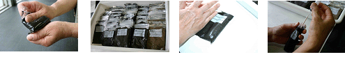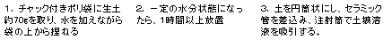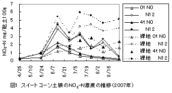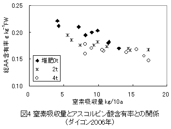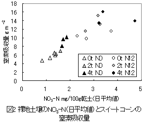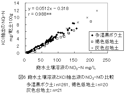 肥料窒素のみを施用した場合と比べて、堆肥を施用することが作物の窒素吸収および品質にどのような影響を与えるかを明らかにする。また、有機物施用土壌の経時的な窒素診断を可能にするため、飽水土壌溶液を用いた簡易な土壌NO3-Nの分析法を検討する。 2.方法 北農研下層台地多湿黒ボク土で、牛糞堆肥0, 2, 4 t / 10aを連用し、窒素施用量3段階(N 0, 6, 12 kg / 10a)でダイコンを、2段階(N 0, 12 kg / 10a)でスイートコーンを栽培した。供試堆肥は牛糞、稲わら主体でC/N比9.3〜10.4、無機態窒素38.5〜102.5 mg/100gである。土壌は検土杖を用いて15 cmの深さで畦間から採取した。生土のKCl抽出液と飽水土壌溶液の無機態窒素をオートアナライザーで測定した。RQ flex法等の簡易測定法も試みた。 3.成果の概要 1) 堆肥の影響 (1) 裸地土壌のNO3-Nは0t N0区で播種期以降緩やかに上昇し、6月中旬から収穫期まで平均1.5 mg/乾土100gで推移した。4t N0区で平均2.2 mg、0t N12区(基肥5+追肥7)で平均4.0 mg/乾土100gと、施肥による上昇が大きかった。一方、栽培土壌のNO3-Nは、作物による吸収にともない次第に低下し、収穫期には0.6 mg/乾土100g以下となった(図1)。 (2) 堆肥施用から収穫までの土壌NO3-Nの日平均値が高いほど窒素吸収量が高まることから、スイートコーンの窒素吸収は堆肥施用、無施用に係わらず基本的には土壌中に放出されたNO3-N量によって決まるものと思われる(図2)。 (3) 窒素吸収量の増加にともない収量は増加し、糖含有率およびアスコルビン酸含有率は低下した。これらの含有率は堆肥施用、窒素施肥にかかわらず作物が吸収した窒素量によってほぼ決まるが(図3)、堆肥の施用が生育の進み具合に影響を与え、乾物率等を介して品質に影響し、堆肥施用で含有率がやや低下する場合が見られた(図4)。 (4) 以上より、堆肥施用、無施用にかかわらず作物が吸収する窒素の主体は土壌中で無機化された窒素であり、糖などの品質成分含有率は窒素吸収量に応じてほぼ決まると考えられる。 2) 飽水土壌溶液を用いた土壌NO3-Nの分析法 (1) 飽水土壌とは土に水を加えつつ捏ねていき、土が光を反射して光沢を持つ点まで加水した状態をいう。ポリ袋に生土約70 gを取り飽水状態まで水を加えて捏ねた後、セラミック管と注射筒を用いて土壌溶液を吸引、採取した(図5)。これは秤やその他の実験器具を用いない現場対応型の試料採取法である。 (2) 飽水土壌溶液のNO3-N濃度は、KCl抽出による土壌NO3-N濃度との間に、作物の生育期間、年次に係わらず高い相関関係があり(図6)、それは褐色低地土でやや異なるものの多湿黒ボク土、灰色台地土で同じであった。また、測定にRQ flexが利用できた。 (3) 以上より、飽水土壌溶液の採取により、土壌の水分を考慮することなく、現場で簡易に土壌NO3-N濃度の測定が可能であり、図6の式により乾土100g当りmgに変換できる。本法は、多湿黒ボク土、褐色低地土、灰色台地土に適用でき、飽水土壌にしたときの含水比は0.5〜0.6である。 ![]() ![]() 図5 飽水土壌の調製と溶液採種の手順 ![]() ![]() 4.成果の活用面と留意点 1) 飽水土壌溶液法は、現場に適用可能な土壌NO3-Nの簡易分析法として、畑地土壌における窒素無機化の追跡に利用できる。 2) 現場での利用に当たっては、同じ基準で飽水土壌を作成するために事前のトレーニングが必要である。 5.残された問題とその対応 飽水土壌溶液法について、供試した3土壌以外の土壌への適応性を検討する必要がある。 |