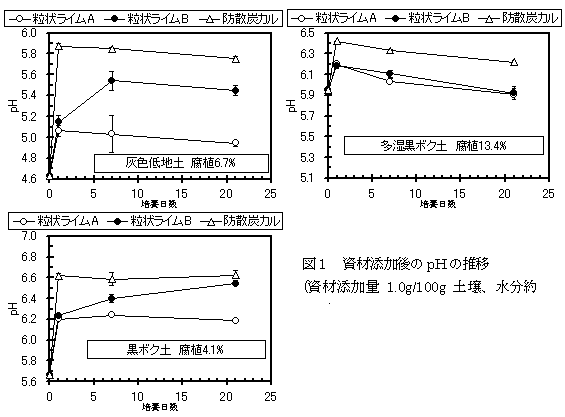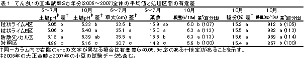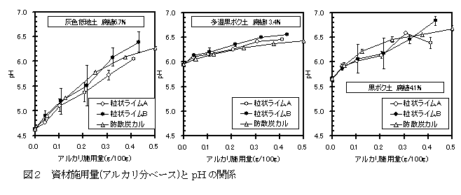 粒状化した脱水ライムケーキ(ライムケーキ(粒状品)、以下、粒状ライムと略)の性状と畑作物に対する施用効果を明らかにし、畑地における適正施用の指針を設定し、未利用資源の循環促進を図ることを目的とした。 2.方法 1)供試資材の概要 造粒方法: 粒状ライムA;高炉セメントB種(セメント)3%とタルク(ケイ酸マグネシウム)2%を添加し造粒。 粒状ライムB;酸化マグネシウム3%とタルク(ケイ酸マグネシウム)を2%添加し造粒。 アルカリ分: 粒状ライムA;41%、粒状ライムB;43%、防散炭カル;50% 水分: 粒状ライムA;18%、粒状ライムB;15%、防散炭カル;0% 粒径: 粒状ライムA;1〜6mm、粒状ライムB;1〜6mm、防散炭カル;1〜4mm 2)圃場試験 (1)試験圃場:2006年;十勝農試(てんさい、菜豆(金時))、本別町(てんさい)。2007年;本別町I(てんさい)、本別町S(てんさい)、本別町A(小豆)、京極町(てんさい)。 (2)処理区(共通):粒状ライムA区、粒状ライムB区、防散炭カル区、対照区 (3)各資材の施用量(各処理区共通、kg/10a):十勝農試(pH5.7);100、本別町(2006年、pH4.0);300、本別町I(pH4.5);600、本別町S(pH4.8);600、本別町A(pH4.6);600、京極町(pH5.3);400。 3)各資材(粒状ライムA、粒状ライムB、防散炭カル)によるpH上昇速度の比較実験(室内実験) (1)供試土壌:黒ボク土(pH5.7)、灰色低地土(pH4.6)、多湿黒ボク土(pH6.0)。 (2)手順:各資材0.8gを粒のまま土壌80gと混合、水32mLを添加後(25℃)、0〜21日後にpH測定。 4)各資材(粒状ライムA、粒状ライムB、防散炭カル)によるpH緩衝曲線実験(室内実験) (1)供試土壌:上記3)と同じ、(2)手順:各資材0, 0.08, 0.2, 0.4, 0.6, 0.8gを粒状のまま土壌80gと混合、ただちに蒸留水200mLを加え24時間静置し5時間振とう後、2分間通気して直ちにpH測定。 3.成果の概要 1)粒状ライムBには市販の防散炭カルとほぼ同等の生育向上・増収効果が認められた(表1)。他方、粒状ライムAの効果は粒状ライムBおよび防散炭カルに劣った(表1)。 2)粒状ライムAによる土壌pHの上昇速度は、防散炭カルや粒状ライムBよりも遅く(図1)、また酸性矯正力も劣る場合があったことから(図2)、粒状ライムAよりも粒状ライムBが石灰質資材としてより優ると判断した。 3)ただし、粒状ライムBは防散炭カルよりは土壌pHの上昇速度が遅く緩効的であった(図1)。 4)粒状ライムBの酸性矯正力は、アルカリ分ベースで防散炭カルと比較した場合には概ね同等であった(図2)。 5)粒状ライムBのpH上昇効果は防散炭カルよりも緩効的でばらつくので、保管中の水分変動をできるだけ抑えるよう留意する。 6)粒状ライムBの投入量を決定するには、「資材添加・通気法」によるpH緩衝曲線に基づくのが望ましいが、「アレニウス氏表」を用いる場合には、現物で防散炭カルの1.2倍量程度とする。 7)以上のように、粒状ライムBは防散炭カルと同様に使用できるが、その効果が防散炭カルよりも緩効的でばらつくことを考慮して使用する。 ![]() ![]() ![]() 4.成果の活用面と留意点 1)粒状ライムBを使用する際には、アルカリ分や水分などの成分を把握して行う。 2)ライムケーキ(粒状品)は,ブロードキャスタ等の現有機械による散布が可能である. 5.残された問題とその対応 |