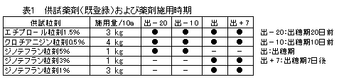 4.成果の活用面と留意点 1)本試験の成果はカメムシに対して水面施用粒剤を使用する上での参考とする。 2)水面施用粒剤の施用に当たっては湛水状態で均一に行い、施用後7日間は湛水状態を保ち、落水及びかけ流しを行わない。 5.残された問題とその対応 1)水面施用粒剤を活用した減農薬体系防除の実証 |