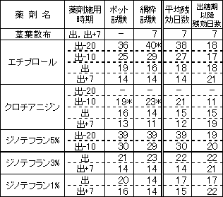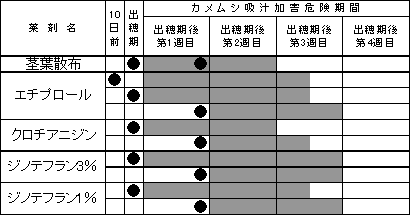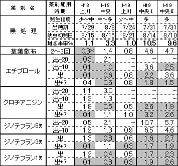 人体や環境への負荷を低減する水面施用粒剤を活用し、水稲のアカヒゲホソミドリカスミカメ(以下カメムシと省略)に対する茎葉散布剤使用回数を削減した新たな防除体系を確立するため、水面施用粒剤の残効特性を明らかにし、最適な施用時期を提案する。 2.方法 1)カメムシ放飼試験:ポットおよび網枠を用いた放飼試験を行い、生存虫数、産卵数、 斑点米率等を調査して各薬剤の施用時期別(表1)残効期間の評価を行った。 (1)ポット試験(H18年)…3ポット/処理、放飼数;4頭(雄雌各2頭)、放飼時期;出穂期か ら7日間隔で出穂期21日後まで、放飼期間;7日間(最終日に放飼虫の生死を確認し除去)、 産卵調査;収穫時10〜20茎/ポット (2)水田網枠試験(H18〜19年)…1網枠(10株)/処理、 放飼数;10頭(雄雌各5頭)、放飼時期;出穂期から7日間隔で出穂期21日後まで、放飼期 間;7日間(最終日に殺虫剤を散布)、産卵調査;収穫時100茎/網枠(10株) ![]() 2)水田試験(H18〜19年):上川農試は現地圃場(旭川市東旭川)、中央農試は農試圃場(岩 見沢市)で各薬剤を4時期(表1)に施用し、すくい取りによるカメムシ密度および斑点 米率などから防除効果の検証を行った。 3.成果の概要 1)カメムシ放飼試験において、水面施用粒剤は各薬剤とも同様の残効特性を示し、出穂期 以前の施用による残効日数が出穂期以降の施用による残効日数より長くなった(表2)。 2)水田試験において、水面施用粒剤の1回施用で高い防除効果(各年次における無処理区 の斑点米率を100とした場合の対無処理比30以下)を示す施用時期が認められた(表3)。 3)カメムシ放飼試験及び水田試験から、1回施用で高い防除効果が認められた水面施用粒 剤とその施用時期(施用後残効日数)を求めた(表2,表3)。 ・エチプロール粒剤:出穂期10日前(27日間),出穂期(18日間),出穂期7日後(14日間) ・クロチアニジン粒剤:出穂期(15日間),出穂期7日後(12日間) ・ジノテフラン3%粒剤:出穂期施用(22日間),出穂期7日後施用(14日間) ・ジノテフラン1%粒剤:出穂期施用(17日間),出穂期7日後施用(15日間) 4)上記水面施用粒剤は1回の施用で少なくとも出穂期後第2週目まで残効期間が認めら れ、茎葉散布剤の2回散布(出穂期および出穂期7日後)と同等の防除効果が期待でき るので、水面施用粒剤を利用することで2回の茎葉散布を省くことができ減農薬が可能 になると考えられる(表4)。 5)水面施用粒剤はその種類、あるいは施用時期によって出穂期後第2週目以降も残効が期 待できるが、出穂期後第3週目にはすくい取りなど発生モニタリングを行い、カメムシの 発生動向に十分注意することが必要である(表4)。