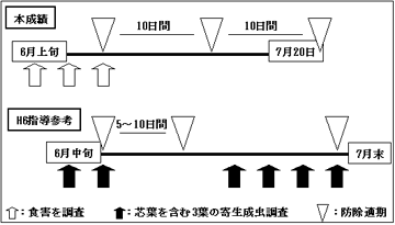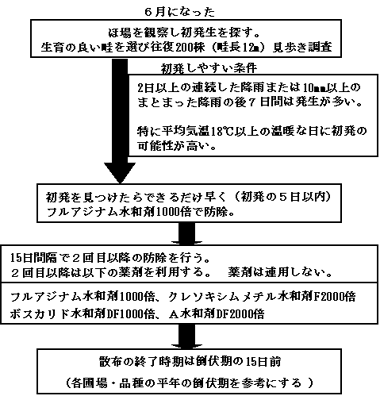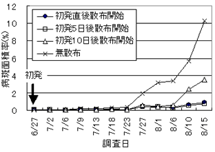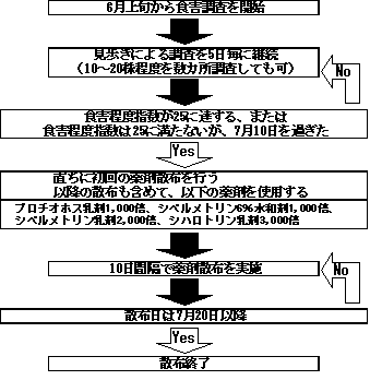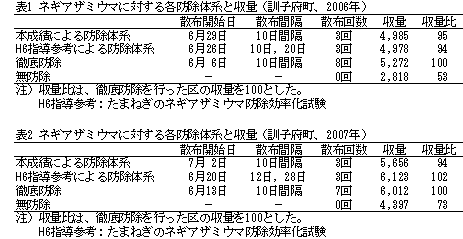 北海道のたまねぎ生産において、ネギアザミウマと白斑葉枯病が生育期の重要病害虫であり、それぞれに対し効率的防除法が示されている。しかし、調査手法が煩雑であること、また防除時期の判断法が示されていないこともあり、発生状況に関わらずスケジュール散布が行われ、散布回数が多いのが実情である。本試験では、この状況の改善のため、それぞれの病害虫の被害解析を行い、簡易モニタリングによる発生対応型防除技術を開発する。 2.方法 試験場所:訓子府町 北見農試場内圃場、長沼町 中央農試場内圃場 1)ネギアザミウマの発生対応型防除技術 (1)薬剤特性試験 (2)散布回数、散布間隔、散布開始適期、散布終了適期の検討 2)白斑葉枯病の発生対応型防除技術 (1)薬剤特性試験 (2)散布回数、散布間隔、散布開始適期、散布終了適期の検討 (3)初発条件の検討 (4)ボトキャストの北海道への適用性の検討 3.成果の概要 1)ネギアザミウマの発生対応型防除技術 (1) たまねぎのネギアザミウマに対して登録がある主要薬剤の比較を行い優劣を明らかにした。プロチオホス乳剤、シペルメトリン乳剤(水和剤)、シハロトリン乳剤の効果が高く、これらの薬剤は10日間隔で散布することが効率的であった。 (2) 殺虫剤散布回数は、ネギアザミウマ発生量の多い地域では3〜4回、少ない地域では2〜3回で高い収量を確保できた。 (3) 食害程度指数が25に達した時に防除を開始すると高い収量を確保できた。 ただし25に満たない場合でも7月10日に達した時点で最初の防除を行うことが適切であった。 (4) 7月を防除の重点時期とみなし、効果の高い薬剤を適切に使う場合は7月20日前後の散布を最終散布とすると高い収量を確保できた。 (5) 栽培期間中にわたり寄生株率調査が必要となる平成6年指導事項「たまねぎのネギアザミウマ効率化試験」と比較して、栽培期間中の調査回数・調査方法が簡便化された(図2)。また、散布回数・収量は平成6年指導参考事項と同程度だった(表1,2)。 2)白斑葉枯病の発生対応型防除技術 (1) 発病が増加するほど収量は低下し、倒伏期の病斑面積率30%で10%減収する(図5)。 (2) 散布開始時期を決定するために有効と考えられたボトキャストは、全道のたまねぎ地帯に適用することは困難であると考えられた。 (3) 本病防除には初発期の散布が重要で、フルアジナム水和剤1000倍散布を初発〜初発5日以内に行うことで最も高い効果が得られる(図4)。 (4) 散布間隔は15日、最終散布は倒伏期の15日前が適当である。フルアジナム水和剤、クレソキシムメチル水和剤F、ボスカリド水和剤DFおよびA水和剤DFは、15日間隔の散布に利用可能である。 (5) 本病が初発する気象条件として、2日以上の連続降雨または10mm以上のまとまった降雨の後7日以内に初発生しやすく、特に平均気温18℃以上で発病する可能性が高かったため、降雨の後7日間生育の良好な200株を観察し、初発を探す(図3)。 ![]() ![]() 図1 ネギアザミウマの発生対応型防除体系 図3 白斑葉枯病の発生対応型防除体系