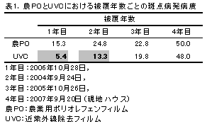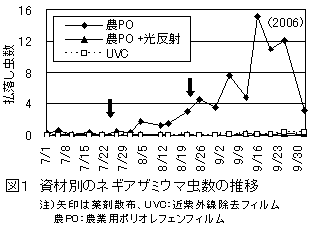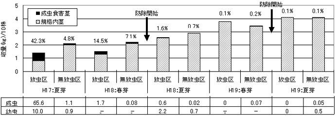 アスパラガスの新しい栽培様式であるハウス立茎栽培およびアスパラガスで新たに問題となっている主要病害虫(斑点病、ネギアザミウマ、ジュウシホシクビナガハムシ)の管理技術を開発し、道産アスパラガスの安定生産に資する。 2.方 法 1)空知管内の立茎栽培地域において夏芽収穫中に発生する斑点病とネギアザミウマの実態調査を行った。 2)花・野菜技術センター内ハウスにおいて品種「ガインリム」、「バイトル」、「スーパーウェルカム」の3品種を定植し、ハウス被覆資材について農業用ポリオレフェンフィルムと近紫外線除去フィルム(UVC)の2種類を用い、品種や資材による病害虫の管理技術について検討した。 3)斑点病に対し適切な薬剤防除開始時期や防除回数について検討した。 4)ネギアザミウマに対し有効薬剤と効果的防除法について検討した。 5)ジュウシホシクビナガハムシについて、南空知及び胆振地方においてハウス立茎栽培での実態調査を行った。 6)ジュウシホシクビナガハムシの放虫試験による被害解析と春芽収穫終了後の幼虫に対する薬剤防除効果及び有効薬剤について検討した。 3.成果の概要 1)斑点病およびネギアザミウマは、立茎栽培では露地栽培と異なり夏芽収穫期から発生し、使用可能な防除薬剤が少ないことから対策が問題となっていた。 2)立茎栽培における斑点病に対しては、8月中旬頃からの発病が蔓延し始める時期にトリミングと薬剤散布により防除する。 3)UVCは被覆2年目までは斑点病の抑制効果が期待できる(表1)。 4)慣行の水平方向灌水に比較し点滴灌水で斑点病の抑制効果が期待できる。 5)斑点病は収穫終了時において少発生程度であれば翌年の春芽収量に影響はない。 6)ネギアザミウマは、立茎開始から寄生し、7月後半に増え始め栽培終了まで増加する。被害は、擬葉のかすり状食痕、若茎の傷や鱗片葉の褐変による商品価値の低下である。 7)ネギアザミウマに対しては、UVCと光反射資材の侵入抑制効果が高く有効であるが(図1)、光反射資材は汚れで効果が低下する。UVCは被覆3年目も効果がみられた。有効薬剤は、アセタミプリド水溶剤、クロチアニジン水溶剤、ついでスピノサド水和剤DFであり、7日間隔2回散布や、トリミング後の散布で効果が高まる。 8)立茎栽培でジュウシホシクビナガハムシ(以下、ハムシ)成虫は春芽収穫時から発見され、10月上旬まで認められた。新成虫は7月上旬から羽化し、8月中旬以降は新成虫が主体となった。幼虫は主に立茎開始の6月中旬以降10月上旬まで観察された。 9)ハムシ成虫による被害は立茎栽培では主に春芽の食害であり、3頭/10株以上になると食害率が10%を超えた。平成17年の放虫試験では、ハムシ幼虫が6月上中旬に約50頭/100側枝と多発して茎葉上部がほうき状となり、当年夏芽と翌年春芽の収量の減少を招いた(図2)。 10)春芽収穫終了後のハムシ幼虫に対する薬剤防除は、幼虫の食害による減収を防ぐとともに、次世代成虫の密度を低減させ若茎への食害を抑制する効果がある(図2)。 11)ハムシ幼虫に対して、収穫前日に使用できる薬剤では、ペルメトリン乳剤とアセタミプリド水溶剤の効果が高く、残効は10〜14日間認められた。 12)アスパラガス立茎栽培における主要な病害虫の管理技術を図3にまとめた。 ![]() ![]() 図2 ジュウシホシクビナガハムシの成幼虫密度とアスパラガスの収量 注)図内の数値は食害率。矢印は春芽収穫終了後の防除開始時期。 成虫頭数は10株あたり、幼虫頭数は100側枝あたりの収穫期間平均頭数。 ![]() 4.成果の活用面と留意点 1)アスパラガス立茎栽培における斑点病、ネギアザミウマおよびジュウシホシクビナガハムシの対策に利用する。 2)ジュウシホシクビナガハムシに対する薬剤防除は幼虫の発生に対応して行う。 3)近紫外線除去フィルムによる斑点病の抑制効果は、被覆3年目以降は期待できない。 5.残された問題とその対応 1)斑点病多発生条件での被害解析 2)ネギアザミウマの要防除水準の設定 |