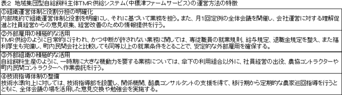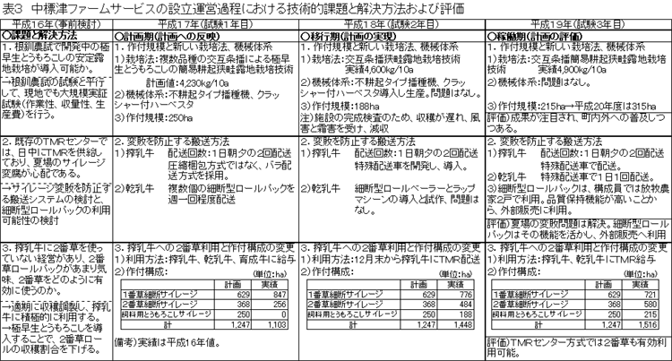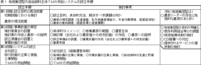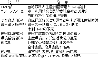 地域集団型の自給飼料主体TMR供給システム(以下、TMR-Sとする。)の設立運営支援実証を踏まえてTMR-Sの設立運営方法を明らかにする。 ※地域集団型:TMR-Sの設立に際し、事業目的を共有した上で意欲ある数戸の農家で設立されたもの を農家集団型とし、地域のほとんどの酪農経営が参加したものを地域集団型とする。 2.方法 1)自給飼料主体TMR供給システムの設立・運営支援 先発事例を参考に、既往技術や本試験研究の開発技術を取り入れた実践モデルとして地域集団型のTMR-Sの設立・運営を支援する。 2)自給飼料主体TMR供給システム設立運営方法の策定 本事例のTMR-Sの調査・分析によりシステムの設立運営方法を明らかにする。 3.成果の概要 1)TMR-Sの設立運営を支援する中で、同システムの設立手順に明らかにした(表1)。 第1段階では、農地の再評価(区画、傾斜、配置)を含めた農家の現況把握であり、第2段階では、検討案の作成と農家への説明、第3段階では、移行計画の立案と実施が重要である。特に、地域集団型では、初期段階で、農家リーダーの存在と地域的な農家のまとまりを考慮すること、検討案作成段階で、既存利用組合等との調整や農家の経営改善を支援する技術指導体制の整備等に配慮した検討を行わなければならない。 2)地域集団型のTMR-Sの運営では、参加農家が多く、経営状況が様々であることから過度に一部の農家に負担が掛からないような組織運営体制と役割分担の明確化や外部雇用、組織の積極的な利用体制の構築、技術水準の早期向上のための農家巡回指導、全体会議での意見交換や勉強会を実施する技術指導体制の整備が重要になる(図1、表1) 3)本事例で解決すべき技術的課題は、以下のように対応し評価を得た(表3)。 ①極早生とうもろこしの安定栽培 方法:新技術導入による作付面積の拡大、評価:平成16年0ha→18年188ha→19年215ha、この成果は注目され、町内外へ普及しつつある。 ②夏場のサイレージ変敗防止 方法:特殊搬送車による朝夕2回配送、評価:変敗は発生していない、細断型ロールベール方式は製品の品質保持機能が高いので、TMRの外部販売(構成員以外)に活用。 ③2番草の有効活用 方法:TMRメニューへ有効活用、評価:平成16年256ha→18年484ha→19年580h 4)稼働後の農家意向調査により、TMR供給事業:個体乳量の増加、安定したTMRの供給、労働軽減、資材一括購入事業:資材価格の低下、技術指導事業:情報の入手、疾病の減少等の具体的な効果が示されたが、その一方で、中核的な部門(TMR部、コントラクター部、技術指導部)の担当者において、時間拘束、労働増加等が指摘されていることから、それらを補佐する人材の配置、あるいは各部門の調整を図る機能強化が必要と思われる。 以上のことから、地域集団型のTMR-Sの設立運営方法を明らかにするとともに、技術的課題および農家意向について評価を行った。 ![]() ![]() ![]() ![]() ![]() 4.成果の活用面と留意点 1)コントラクタ等のある地域で、地域集団型のTMR-Sを設立する際に活用する。 2)検討案作成に利用した計画作成システムの提供は、根釧農試、畜試に問合せのこと。 5.残された問題点とその対応 1)TMR-Sの参画農家の経営評価とTMR-Sの次なる組織戦略と展開方向 |