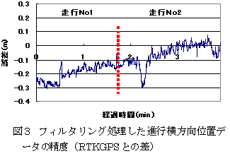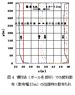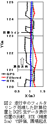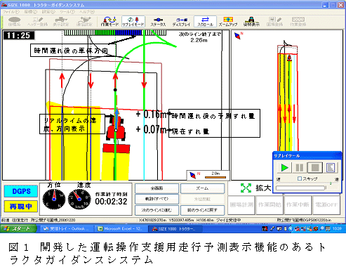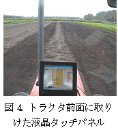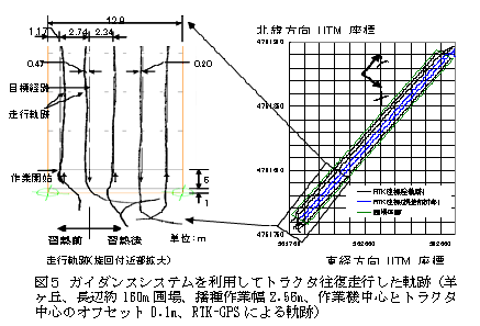 農家戸数が年々減少する中、1戸当たりの経営面積の増大、熟練者不足により、益々省力で高速かつ高精度作業が求められている。そこで、農業者が容易に利用でき、大区画圃場での高精度な作業が可能なGPSを利用した圃場作業用運転支援ガイダンスシステムを開発し、実証での適用効果を明かにする。 2.方法 1)GPSと姿勢センサ(方位センサ内蔵の3軸ジャイロ)とノートPC、外付け液晶パネルを接続し、GPSの位置、速度情報をPCに取り込み、圃場区画、作業条件に応じて目標作業経路を表示し、現在位置、進行方向、作業速度、作業範囲をリアルタイムに表示するガイダンスシステムを開発し、圃場において各種作業試験を行う。 2)姿勢センサの方向データとGPSの位置、速度情報から、フィルタリングしたシステムの位置、方向、速度データの精度を調べるため、位置精度の高いRTK-GPSと3軸FOG姿勢計測装置を搭載し、圃場を走行して精度を検証する。またGPS単体においてもフィルタリングを行い、安定性を検証する。 3)開発したガイダンスシステムを用いて、北農研圃場、安平町での広幅施肥機による小麦の追肥作業試験、佐呂間町畑作農家の大規模圃場での粗起こし作業試験、融雪剤散布作業試験などでの実証試験でシステムの実用性を検証する。 3.成果の概要 1)作業条件・圃場情報、作業方法の登録・修正、GPS情報のリアルタイム表示、各種の座標系、目標作業ライン表示、作業軌跡表示、自動画面スライド、自動作業記録・リプレイ機能、運転操作用状態予測誘導表示(0.5〜3秒後の車両位置、変位、方向を計算して表示する)、転回ガイドライン表示、シェープファイル背景図読み込み、方位視点切り替え、複数画面表示、タッチパネルによる簡単入力などの機能を有するグラフィックユーザインターフェース(GUI)の運転操作支援ソフトを共同で開発した(図1)。 2)GPSの位置、速度データとジャイロの方向、姿勢データをフィルタリングし、精度を向上させることができた(図2、3)。GPSデータが取得できないときにもデッドレコニング(内界センサ等で位置認識を行うこと)で短時間の間で位置、方向表示が可能である。作業中の表示位置誤差はRMS15cm、±40cm以内である。GPS単体でも平坦地では、位置誤差は同程度であったが、方向表示の応答性と精度は若干劣った。 3)本システムを利用してトラクタ往復走行を行う場合、目標作業経路からのずれ(運転精度)を±20cm以内とし、設定した任意の作業幅の等間隔作業ができる。慣れるに従い追随精度を向上でき、図5のように作業幅に応じて一定間隔の平行作業ができる。作業速度15km/hまで使用可能である。 4)現地農家での利用試験(図6)では、始めは画面の表示にとらわれて蛇行したが、1往復して慣れると作業精度が向上し、小麦追肥、粗起こし作業とも実用性が高いことを確認した。表示画面をトラクタパネル前面に設置して前方視野に入った方が視点をずらさずにすみ、直進が保たれる。 5)慣行法のポールを目印にした小麦の追肥作業(散布幅23m)で、散布軌跡をGPSで調べた結果、一部で最大1.2m程の散布もれがあった(図7)。ガイダンス利用により作業跡を確認しながら修正ができる。 6)圃場区画の地図取得としてGoogle Earthを利用して圃場マップ、ガイダンス背景図作成を行った。 4.成果の活用面と留意点 1)1行程距離の長い大区画圃場や傾斜地(10°以内)、またマーカの使用できない圃場でも高精度な平行直進作業や中割り、飛び越し作業が可能である。変形圃場での曲線作業には対応していない。 2)本システムの適応作業は、耕起、肥料・薬剤散布、融雪剤散布、牧草の反転集草作業などである。 3)システムの使い方に慣れるのに半日程度かかる。モニタ装置は作業時の視野の範囲内に設置する。 4)2007年9月よりジオサーフ社より市販化されている。 ![]() ![]() ![]() ![]() ![]() 5.残された問題とその対応 ユーザーの用途に合わせたシステムの改良、変形圃場での曲線作業への対応、自動走行機能の付加、低価格化。 |