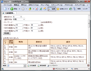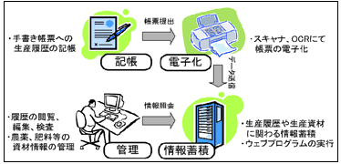 食の安全性への関心の高まりから、生産現場においては厳密な生産工程の管理を行なうために、JA等が中心となり生産履歴の記帳およびそれらの検査を行うことが一般的になってきている。しかし、それらの業務が生産現場の大きな負担となってきている。 そこで、肥料、農薬等の生産資材情報や生産履歴情報を電子化し効率的な管理を行なうシステムの開発を行なう。 2.方法 1) 農薬、肥料等の生産資材情報のデータベース化を行なう。農薬データは、社団法人日本植物防疫協会JPP-NETの提供する農薬データベースを再構築して整備する。肥料データは、本システム利用者を中心にデータの収集・蓄積を行なう。 2) 生産履歴を電子化し効率的に管理できるシステムを開発する。ITが不慣れな利用者に考慮して、手書き帳票をスキャナおよびOCRソフトウェアにより電子化する方法を採用する。電子化した情報は、ウェブサーバ上のデータベースで一元管理を行ない、利用者はウェブブラウザを用いることで、生産履歴の閲覧・編集等の作業が行えるシステムを構築する。 3) 電子化した生産履歴のうち、肥料、農薬に関するデータの分析を行なうシステムを開発する。肥料については、成分ごとの集計を行えるものとする。農薬については、農薬取締法における基準に対する適否判断および、YES!clean栽培における農薬使用計画に対する適否判断を行なうことができるものとする。 4) 本システムを、北海道内の4JA(組合員数は合計約4,000名)にてシステムの実用性を検証する。 3.成果の概要 1) 本システムは、生産資材、生産履歴に関する情報を電子化し、サーバ上のデータベースに情報蓄積する。それらの情報はインターネットを介して管理ができる(図1)。生産履歴情報は、手書き帳票をスキャナ、OCRソフトウェアを用いて電子化を行ない、その後データベースへ格納する。スキャンからデータベースに格納までに要する時間は帳票1枚(両面)あたり1〜2分であった。 2) 農薬は、すべての農薬を対象としたデータの利用が可能となった。肥料は、平成19年11月現在、約1,000件の資材についての情報を収集でき、それらの情報をウェブブラウザ上で検索、閲覧するシステムを開発した(図2)。 3) 肥料については、2)で収集したデータにより、各生産履歴における肥料成分ごとの総施用量の把握が可能となった。農薬については、使用回数や倍率等の登録基準内の使用であったかを自動的に判断するシステムを開発した。また、YES!clean栽培の農薬使用計画に基づいた使用であるかを自動的に判断するシステムを開発した(図3)。なお、これらのシステムは、すべてウェブブラウザ上で使用することができる。 4) 3年間の4JAでの稼働では、システムが問題なく稼働することを確認した。