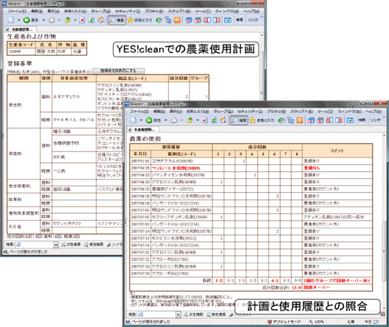 ![]() 図3 YES!clean栽培における農薬使用計画と履歴の照合 4.成果の活用面と留意点 1) JA等の生産者団体における生産履歴、生産資材情報の管理に活用できる。 2) 本システムは、ウェブサーバの使用を前提としている。システム利用に当たっては、セキュリティ等を確保してウェブサーバを運用できるノウハウが必須である。 3) 本システムは、生産資材の使用履歴の適否判断等を行なうことができるが、生産履歴の内容を保証するものではない。 4) 本システムは、独立行政法人農業・食品産業技術総合研究機構の知的財産データベースに「生産資材、生産履歴マネージメントシステム」として登録されている。利用には、当機構への利用許諾申請が必要である。また、JPP-NETとは別途契約が必要。 5.残された問題とその対応 1) 肥料データベースについては、利用場面によってはデータ内容に不足が生じる可能性がある。今後にむけて、データ整備の方法を検討していく。 2) 本システムは、すべての生産者の履歴を電子化する必要性から、手書き帳票による電子化手法を用いたが、ITを十分に活用できる生産者からはPC等のメディアを活用した記帳方法の導入を要望されている。今後、開発を行ないたい。 |