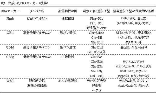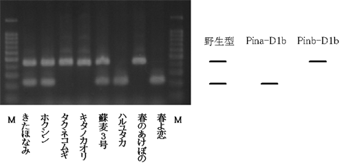 小麦育種の効率化のため、小麦の品質に関連する遺伝子型を判別するDNAマーカーを作成し、その有効性を検討する。 2.方法 1) DNAマーカーの作成 既往の研究報告およびデータベース (DDBJ)などの情報を参考として、小麦の硬軟質性を決定するピュロインドリンの主要な遺伝子型、高分子量および低分子量グルテニンサブユニットの主要な遺伝子型、Wx-B1遺伝子の欠失をそれぞれ判別できるDNAマーカーを作成した。 2) DNAマーカーによる遺伝子型の判別 小麦葉身からDNAを抽出し、PCR法を用いて遺伝子を増幅した。PCR増幅産物は2%アガロースゲルで電気泳動し、サイバーゴールドで染色後、遺伝子型を調査した。 3.成果の概要 1) 硬質(パン用、中華めん用等)小麦、軟質小麦の判別ができるDNAマーカーを作成した(表1、図1)。圃場立毛中に遺伝子型の調査を行うことで、収穫前に硬質小麦を選抜することが可能となった。 2) パン用小麦育種の効率化のために、製パン適性が向上するグルテニンサブユニットGlu-D1d型が判別できるDNAマーカーを作成した(表1)。また、小麦の生地物性に関与するグルテニンサブユニットの遺伝子型を判別できるDNAマーカーも作成した。DNAマーカーを利用することで、収穫前に生地物性や製パン適性の推定が可能となった。 3) アミロース含量がやや低く、粘弾性に優れる日本めん用小麦の遺伝子型であるWx-B1欠失型を判別できるDNAマーカーを作成した(表1)。収穫前に基本系統の遺伝子型調査を行うことで、Wx-B1欠失型に固定した系統を確実に選抜することが可能となった。 4) 北海道小麦品種・系統、遺伝資源について作成したDNAマーカーを用いて遺伝子型の調査を行い、遺伝資源の特徴を明らかにできた。 ![]() ![]() 図1 DNAマーカーを用いたピュロインドリン遺伝子型の判別例 4.成果の活用面と留意点 1) 本方法は小麦品種改良における選抜、遺伝解析材料作出、有望系統の早期作出等に幅広く活用でき、育種の効率化に貢献できる。 2) 以下の遺伝子に関連するDNA配列はこれまで報告がなかったことから、データベースに登録した。Pina-D1b領域(AB262660)、Glu-B1i領域( AB263219)、「ホクシン」のGlu-B3g領域(AB262661)、「ホクシン」「きたもえ」のWx-B1領域(AB272097、AB272098)。 5.残された問題点とその対応 品質関連遺伝子の組み合わせが品質に及ぼす影響の検討 |