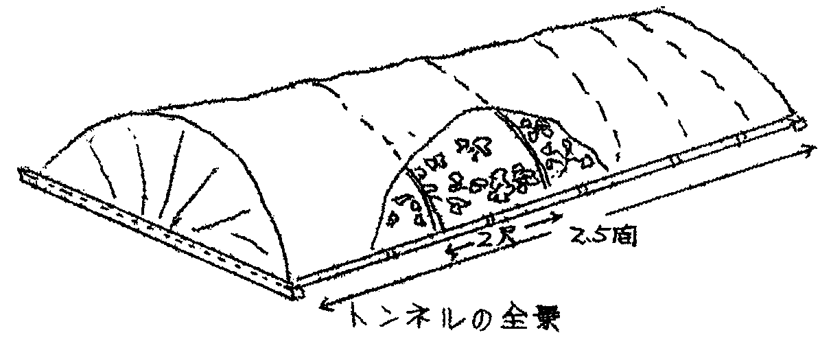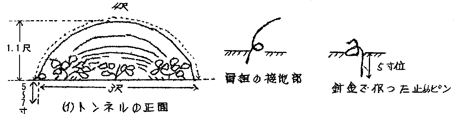 トンネルは厚さ0.1mm巾4.5尺の梨地ビニールを用い、骨組みを十番線の針金にして次の要領で行った。針金は約6尺2~3寸位に切り地上部が4尺になる様にし地中にさし込む長さは5~7寸位にした。途中に輪を作ったのは骨組みが整一に設置出来易いようにするためである。