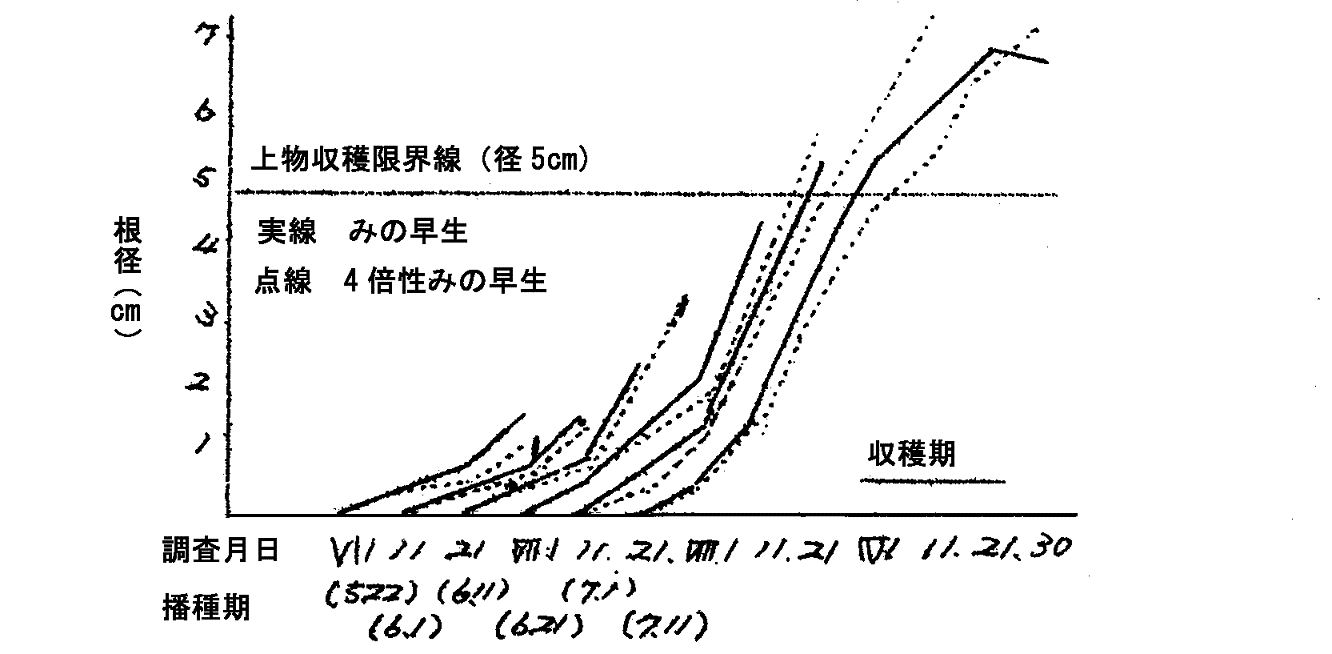 みの早生大根は生態型が秋播大根系に属し耐暑性強く品質優良で時無大根につづき早く出荷したいが早播に失すると抽苔し品質不良となる。播種期と根径肥大との関係は第1図に示す通りであるが、播種後20~30日から急激な根部肥大が行われその程度は「4倍性みの早生」に比し「みの早生」が稍速であり尚、抽苔は「4倍性みの早生」の方が遅い。播種期については早い程抽苔が速で5月下旬播に於いては根径僅か1.5cm位で抽苔に至る。