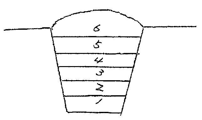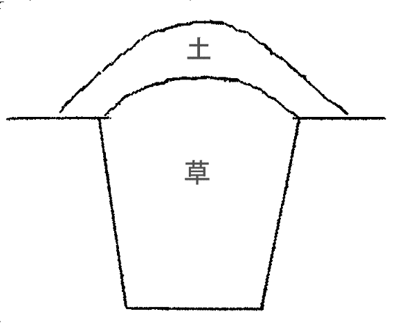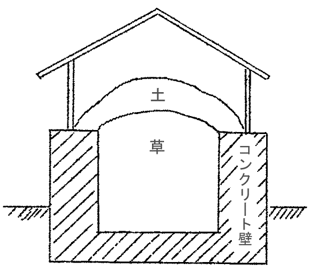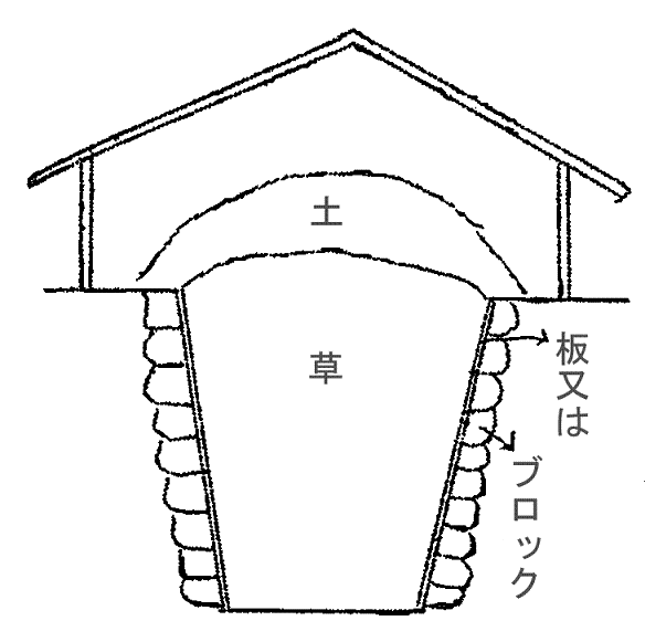 原料草の刈取。牧草類が刈取適期であれば午前中に刈取。3~4時間陽風にあてて予乾する。運搬。細切しながら添加物。踏付。加圧。管理。図の如く適当な厚さごとに切り込みと踏付を繰り返し、最上部の場合には、サイロの高さより1~1.5尺盛上げ、充分に踏付する。それが終了すれば上表面を農業用ビニールで覆い更に乾草、麦稈又は莚の如きものを敷き、その上に1尺以上盛土をする。ビニールを使用しない時は乾草または筵で覆ってもよいがこの場合は幾分上部が腐敗する。場合によっては盛土を直ちに行わず、埋草後3日間位を毎日踏付けし、落付かせた上に充分盛土するのも一方法である。盛土には、サイロを掘った時の土を利用する。盛り土による加圧不充分な場合は別途土嚢を用意する。更にサイロ周辺を傾斜の方向に排水路を作り、屋根又は被覆物を配すれば、雨水の浸入を防ぐことが出来る。