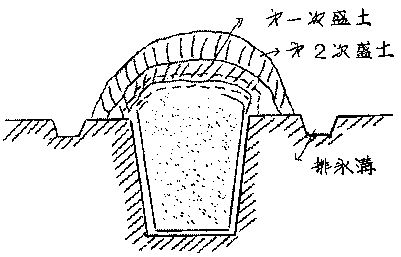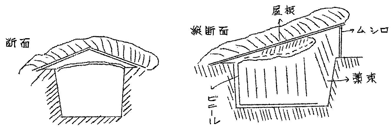次にその上に外面用ビニールを被覆し、中の空気を充分出しながら地下に差し込むその上にムシロ又はカマスなどを以てビニールをいためないように被覆し、第1次の盛り土を行
