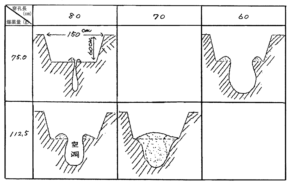 (1) 先ず初めに普通の深さの(径150cm、深さ60cm)植穴を人力で掘って置き、その下層の堅硬層を爆薬によって60~80cm程度深く掘ることを企図した。