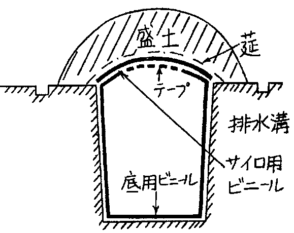 ① トレンチサイロ : サイロ側面用のビニール上端のおのおの両側をビニールテープで貼り合わせ、さらに一枚の上面被覆用をカバーにし、その上に莚または叺袋をのせ、さら