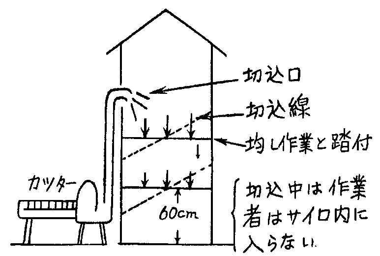 ッターを空転させて空気の換流を図り、2~5分後に直径270cm(9尺)のサイロでは5~8人が10~15分間均し作業と踏付を行う。