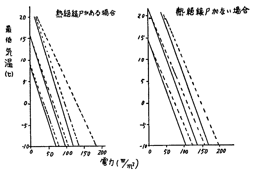 育苗上必要とする温度を得るための電力は電熱温床を設置しようとする地域の気候に応じて決めなければならない。最低気温と必要とする床内地温(3cm)を維持するための所要電力は第4図のとおりである。