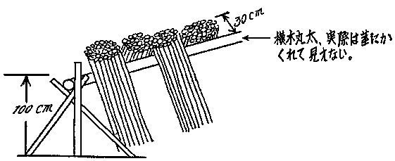 「生茎バラ干し」「半日地干し、茎バラ干し」は、いずれも厚みに30cm横木に立てかけたが「半日地干し、茎バラ干し」の処理後の厚みは第2表の如くで、「生茎バラ干し」の厚みが薄いが、これは乾燥によるもので生茎を干すため横木の長さは「半日地干し、茎バラ干し」より多く要した。