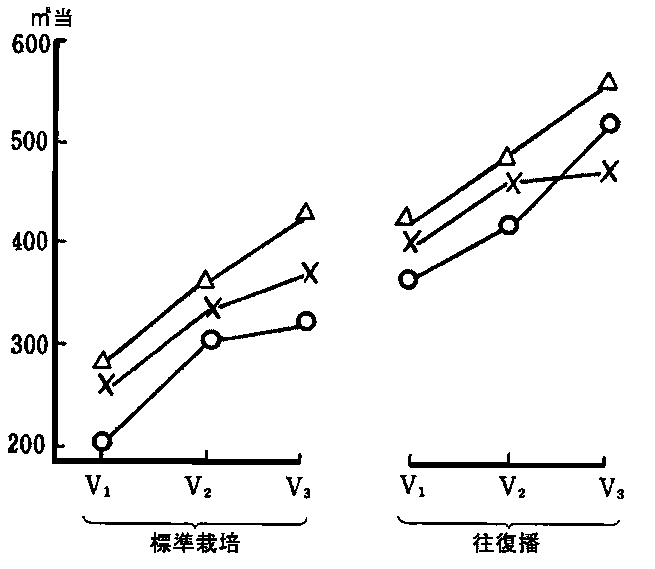 ⅰ) 倒伏: 標準栽培においては播種量が増すごとに倒伏程度が多くなるが、往復播の場合は播種量の多少にほとんど差がみられない。栽培法の比較では往復播は標準栽培よりも倒伏が少なくなり倒伏性に対し安定度の高いことが認められる。
