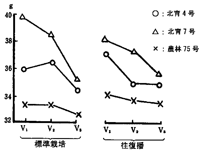 ⅱ) 千粒重: 栽植様式間には一定の傾向はみあられないが、播種量を増すと減少し、減少の程度は大粒(北育7号)ほど大きく、小粒(農林75号)では、その程度は最も小さい。