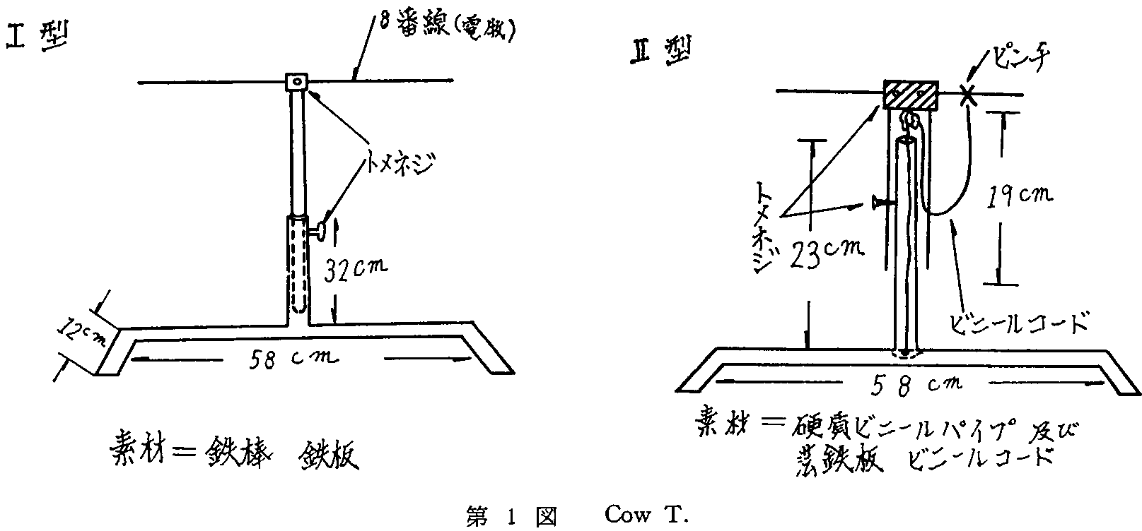 1) 使用したカウ・トレーナー(以下略してCow T.)使用したCow T.の概略図は第1図に示したⅠ型は金属製Ⅱ型は硬質ビニールパイプ、薄鉄板及びビニールコードよりなっている。