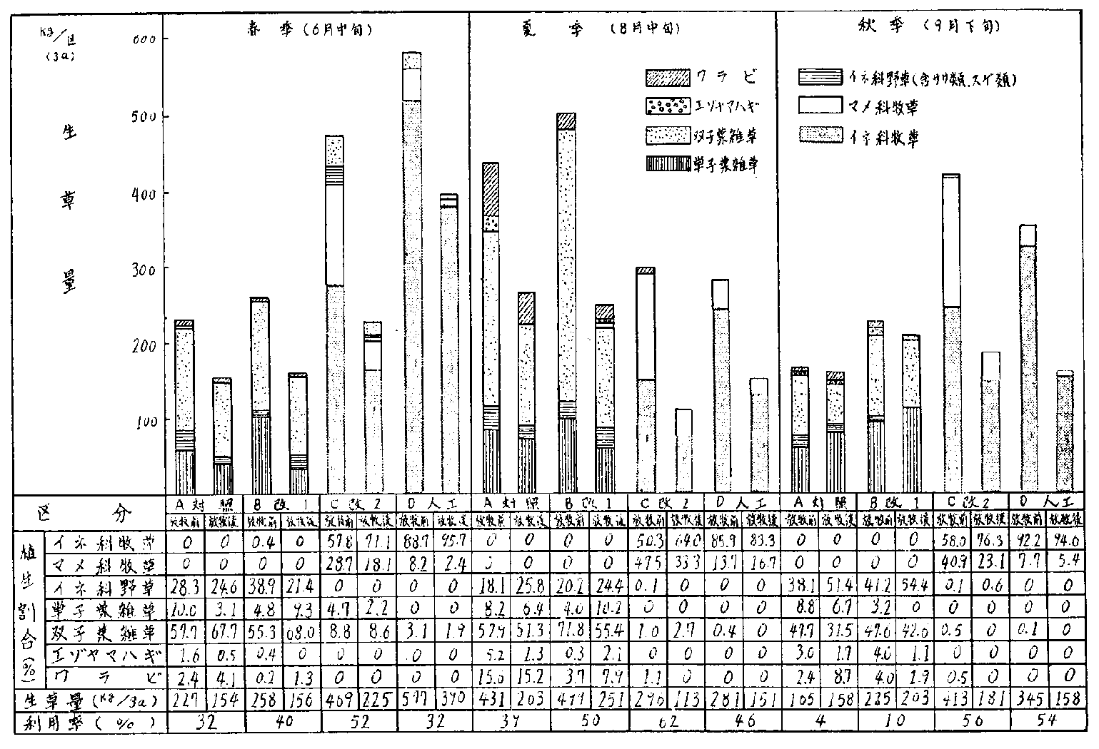造成後は、これらの組合せによって導入草種と原植生の競合及び生産性を究明するとともに、最終的には家畜に対する嗜好性調査を試みた。