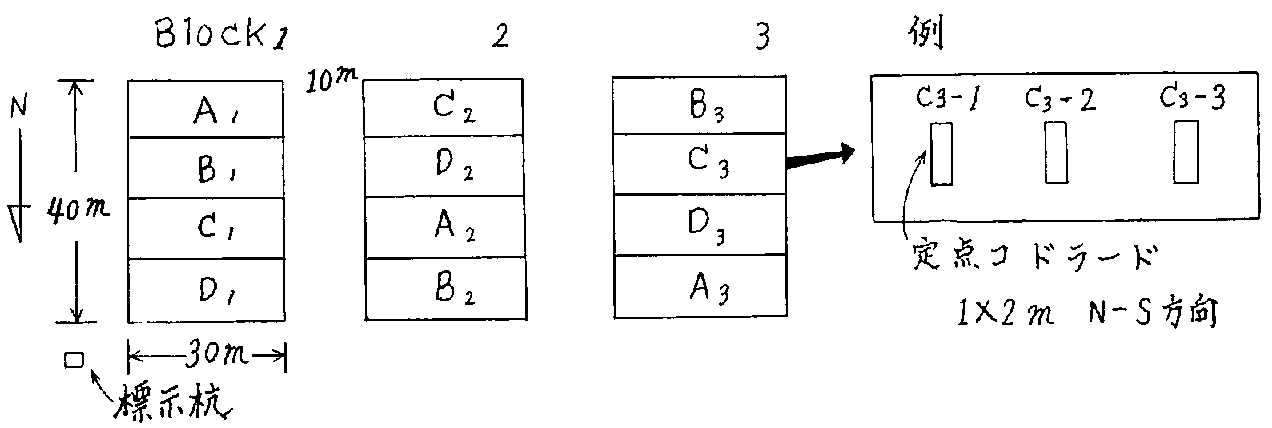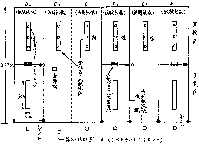 試験地は対照地区及びPassを含め0.79haとした。1plotの面積は0.5a(5.5×9.0m)で2整地処理×3肥料処理×8草種×2反覆=96plotsである。