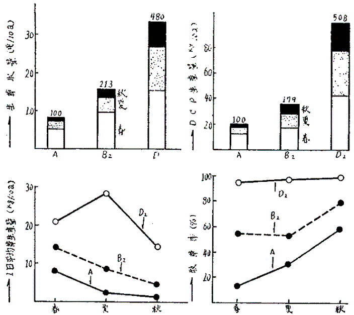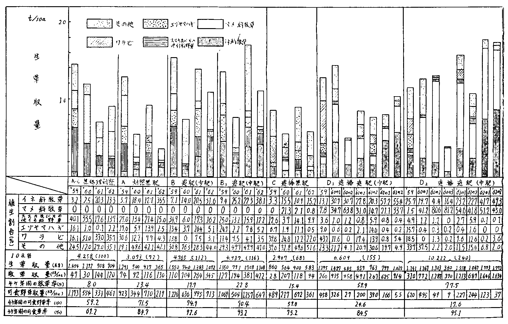 | 3ヵ年平均生草量(屯/ha) | 6.0(100) | 11.9(198) | 30.3(505) | |