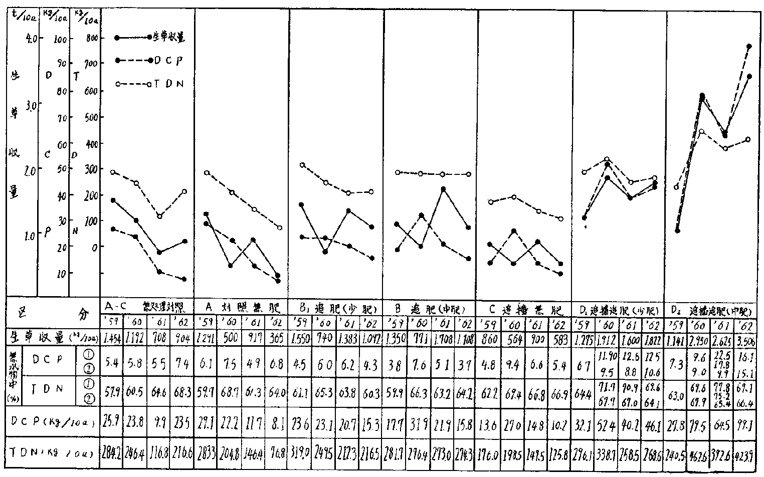 DCPの生産費も補助を受けた時には30%近く減少した。現在では、市販される配合飼料のDCP1㎏が200円~250円に比較するならば、合理的な草地改良によって1/4~1/5の経費で供給しうることが示された。