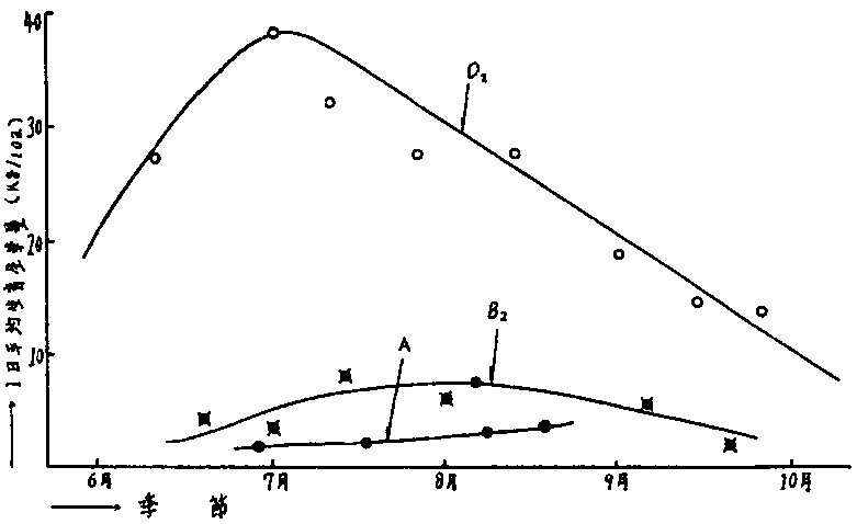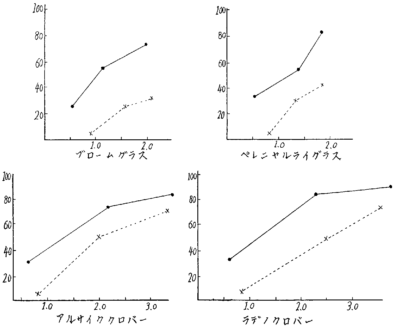 但し、イネ科草には日東草地化成3号(N:P2O5:K2O=8:11:8)を用い。マメ科草には1号の4:12:10を用いた。