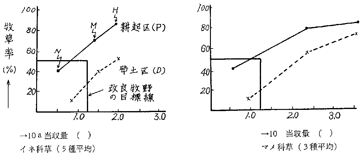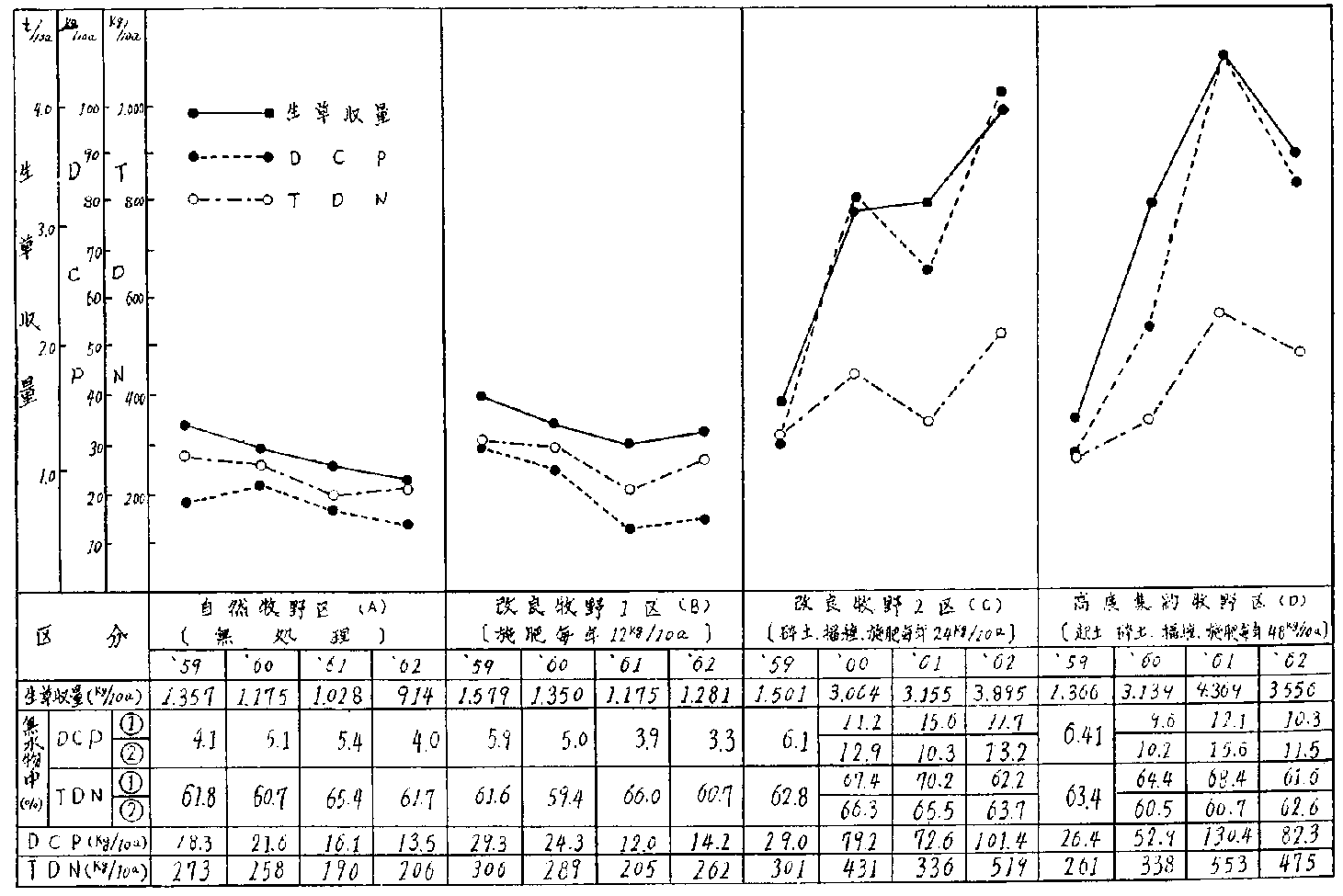土壌の化学性の調査結果では、いずれの区においても、有効成分の減耗が認められた。これらのことから改良牧野は比較的安価な経費で、草生改良の効果が認められるが、その後は合理的な追肥管理とか、数年後には高度集約牧野への推進を計るなどのことが必要であろう。経済性の検討の結果では、耕起、砕土地区の3ヵ年の造成維持経費は無肥区では10a当り4,700円補助を受けた時には2,600円、24kg/10aの区では6,300円と4,000円、48kg/10aの区では7,800と5,300円であった。生草1㎏の生産費はイネ科5種の平均では無肥区2.91円、24kg/10a区1.49円で48kg/10aの区では1.32円と追肥によって造成経費は高くなるが、草生の著しい改善によって経済的草生産が期待しうることが示され、特に肥料を伴はない牧草の導入は無意味であるか、むしろ不経済であることが示された。また補助を受けた時にはさらに30%生産費が軽減されることが知られた。又DCPの1㎏生産費は耕起、砕土地区のチモシーでは無肥区は74.4円、24kg/10a区72.8円、48kg/10a区では52.6円となり、ラジノクロバーでは各々97.8円、37.6円、32.8円と生草生産費と同じような傾向であった。