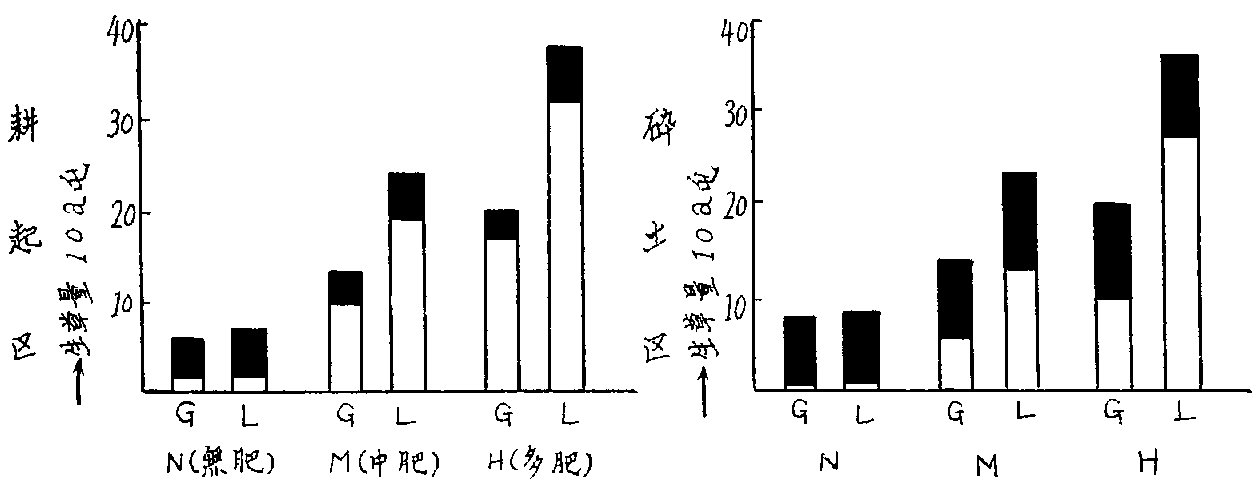 B 肥料処理 両整地区を無肥区(N)、中肥区(M)と多肥区(H)に3区分とした。