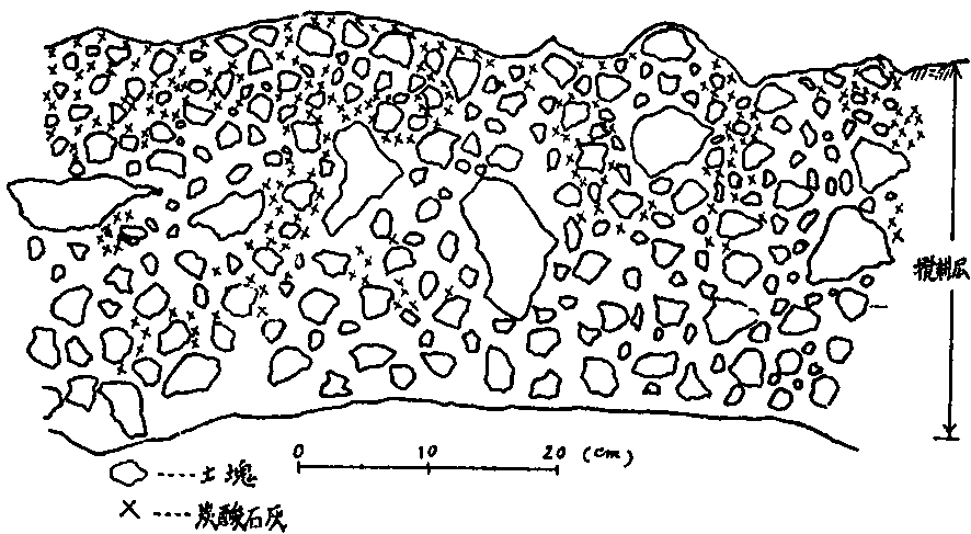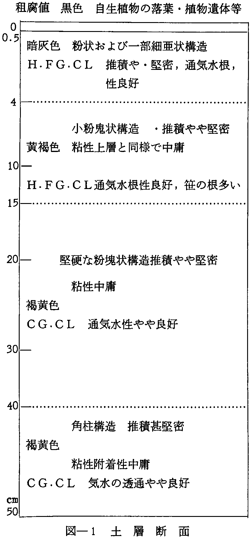 ⅲ) 土性、表面には径3~6㎜の礫が多く、5~15㎝大の礫を混在する埴壌土であり、代表的土層断面および物理性は図-1および図-2に示すとおりである。なお表層は2㎝凍結していた。