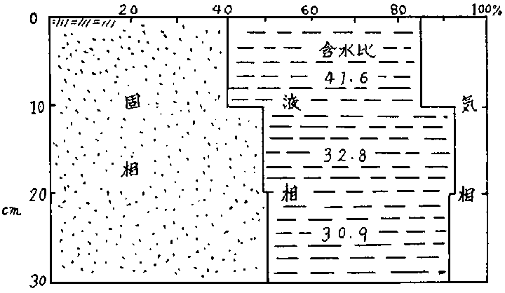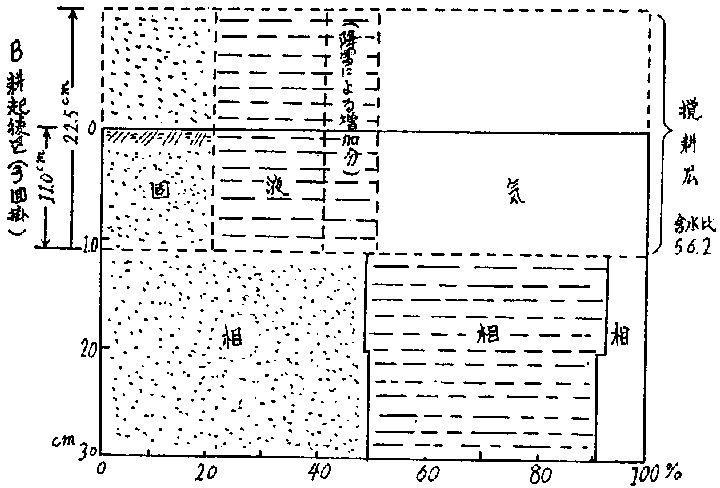 未墾地および耕起後地を同一方向に回デスキングした後の土の三相容積の変化を図-3に示す。膨土の割合を施行前後の土の密度より求めた結果、未墾地ではみかけの耕深17.5㎝、正味耕深8.5㎝、ブラツシユブレイカーによる耕起後地ではみかけの耕深22.5㎝、正味耕深11㎝であった。すなわち約2倍の膨土を示した。