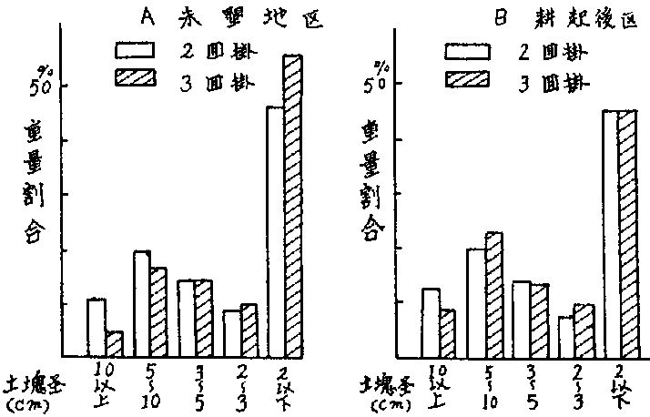 砕土状況を調べるために、施行直後0.5㎡の攪耕された土壌を採取し、節別後重量比を求めた。その結果を図-4に示す。土の表面2㎝位は凍結してあり、また同一方向に施行したが、凍結していない状態で交又してデスキングすればさらに砕土されよう。