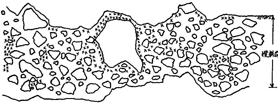 重粘性土壌地帯の草地化は少なくとも0.3~0.5t/10aの炭酸石灰の施用が必要である。石灰の攪混状況を調べるためブラツシユブレイカーにて耕巾65㎝、耕深20~25㎝に反転耕起し、1回デスキングして地表面を平にした後、6t/10aの炭酸石灰を撒布し、さらにデスキング1回(石灰撒布前を合せて2回がけ)と2回(同3回がけ)とについて観察したのが図5である。(断面に透明ビニールを当て、スケッチし、また北農式酸度検定液を大判濾紙に吸着させ乾燥しこれを攪耕層の断面に当て蒸留水を吹きつけ反応を調べ。)